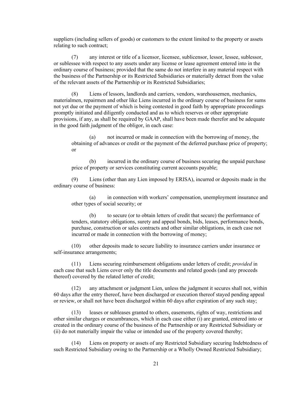 21名供应商(包括货物出卖人)或客户,但限于与该合同有关的财产或资产;(7)许可人、被许可人、分许可人、出租人、承租人、转租人或分承租人就在正常业务过程中订立的任何许可或租赁协议项下的任何资产的任何权益或所有权;但同样不干预合伙企业或其受限制子公司业务的任何重大方面或实质性减损合伙企业或其受限制子公司相关资产的价值;(8)出租人的留置权,房东和承运人、供应商、仓库管理员、机械师、材料师、修理工和其他类似的留置权在正常业务过程中因尚未到期的款项或其付款正受到迅速启动和勤勉进行的适当程序的善意质疑而产生,并且就哪些准备金或其他适当规定(如有)应已为此作出,并在债务人的善意判断中是充分的,在每种情况下:(a)未因借款而产生或作出,获得预付款或信贷或支付财产的递延购买价款;或(b)在正常经营过程中发生的担保构成经常应付账款的财产或服务的未付购买价款;(9)留置权(ERISA施加的任何留置权除外),在正常经营过程中发生的或作出的存款:(a)与工人赔偿、失业保险和其他类型的社会保障有关;或(b)担保(或获得担保)履行投标、法定义务、担保和上诉保证金、投标、租赁、履约保证金、购买、建造或销售合同及其他类似义务,在每种情况下均未因借款而招致或作出;(10)根据保险或自保安排为保证对保险承运人的赔偿责任而作出的其他存款;(11)保证信用证项下偿付义务的留置权;但在每种情况下,此种留置权仅涵盖相关信用证所涵盖的所有权单证和相关货物(及其任何收益);(12)任何扣留权或判决留置权,除非其保证的判决不得在其进入后60天内,已被解除或暂缓执行以待上诉或覆核,或不得在任何该等中止期满后60天内解除;(13)授予他人的租赁或转租、地役权、通行权、限制和其他类似的费用或产权负担,在每种情况下(i)均被授予,在合伙企业或任何受限制子公司的正常业务过程中订立或创建或(ii)不会对由此涵盖的财产的价值或预期用途造成重大损害;(14)对任何受限制子公司的财产或资产的留置权,以确保该受限制子公司欠合伙企业或全资受限制子公司的债务;