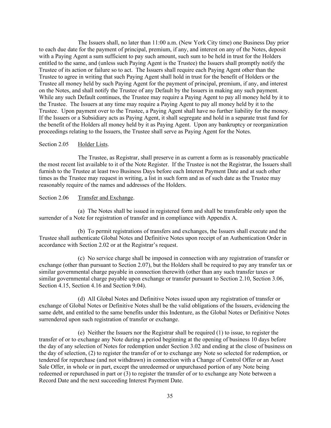 35发行人应不迟于任何票据的本金、溢价(如有)和利息的支付的每个到期日前一个营业日上午11:00(纽约市时间)向付款代理人存入一笔足以支付该金额的款项,该款项将为有权获得该金额的持有人以信托方式持有,并且(除非该付款代理人是受托人)发行人应将其作为或不作为的行为及时通知受托人。发行人应要求除受托人以外的每一付款代理人书面约定,该付款代理人应为持有人或受托人的利益以信托方式持有该付款代理人为支付票据本金、溢价(如有)和利息而持有的所有款项,并应将发行人在支付任何该等款项时的任何违约情况通知受托人。当任何此类违约继续发生时,受托人可要求付款代理人将其持有的所有款项支付给受托人。发行人可以随时要求付款代理人将其持有的全部款项支付给受托人。一旦支付给受托人,付款代理人将不再对该款项承担任何责任。发行人或子公司作为支付代理的,应当将其作为支付代理持有的全部款项分离并在单独的信托基金中为持有人的利益而持有。在与发行人有关的任何破产或重组程序中,受托人应担任票据的付款代理人。第2.05节持有人名单。受托人作为注册官,须在合理切实可行范围内,以最新格式保存其可获得的票据登记册最新名单。如受托人并非注册官,则发行人须在每个利息支付日期前至少两个营业日,以及在受托人以书面要求的其他时间,向受托人提供一份格式及截至受托人合理要求的持有人姓名及地址的名单。第2.06节转让和交换。(a)票据须以记名形式发行,并须在交出转让登记的票据并符合附录A后方可转让。(b)为容许转让及交换的登记,发行人须在收到根据第2.02条发出的认证令后或在书记官长的要求下,签立及受托人须认证全球票据及确定票据。(c)不得就任何转让或交换的登记征收服务费(依据第2.07条除外),但持有人须缴付与此有关而须缴付的任何转让税或类似政府押记(依据第2.10条、第3.06条、第4.15条、第4.16条及第9.04条在交换或转让时须缴付的任何该等转让税或类似政府押记除外)。(d)在全球票据或确定票据的任何转让或交换登记时发行的所有全球票据和确定票据应为发行人的有效义务,证明相同的债务,并有权根据本契约享有与在此类转让或交换登记时交出的全球票据或确定票据相同的利益。(e)发行人或注册处处长均无须(1)在根据第3.02条作出赎回的任何选择票据的营业日期前10天开始并在选择当日营业结束时结束的期间内,发行、登记任何票据的转让或交换任何票据,(2)登记如此选择赎回的任何票据的转让或交换,或就控制权变更要约或资产出售要约提出回购(而非撤回),全部或部分赎回,但任何票据的未赎回或未购买部分被部分赎回或回购,或(3)在记录日期和下一个利息支付日期之间登记任何票据的转让或交换。