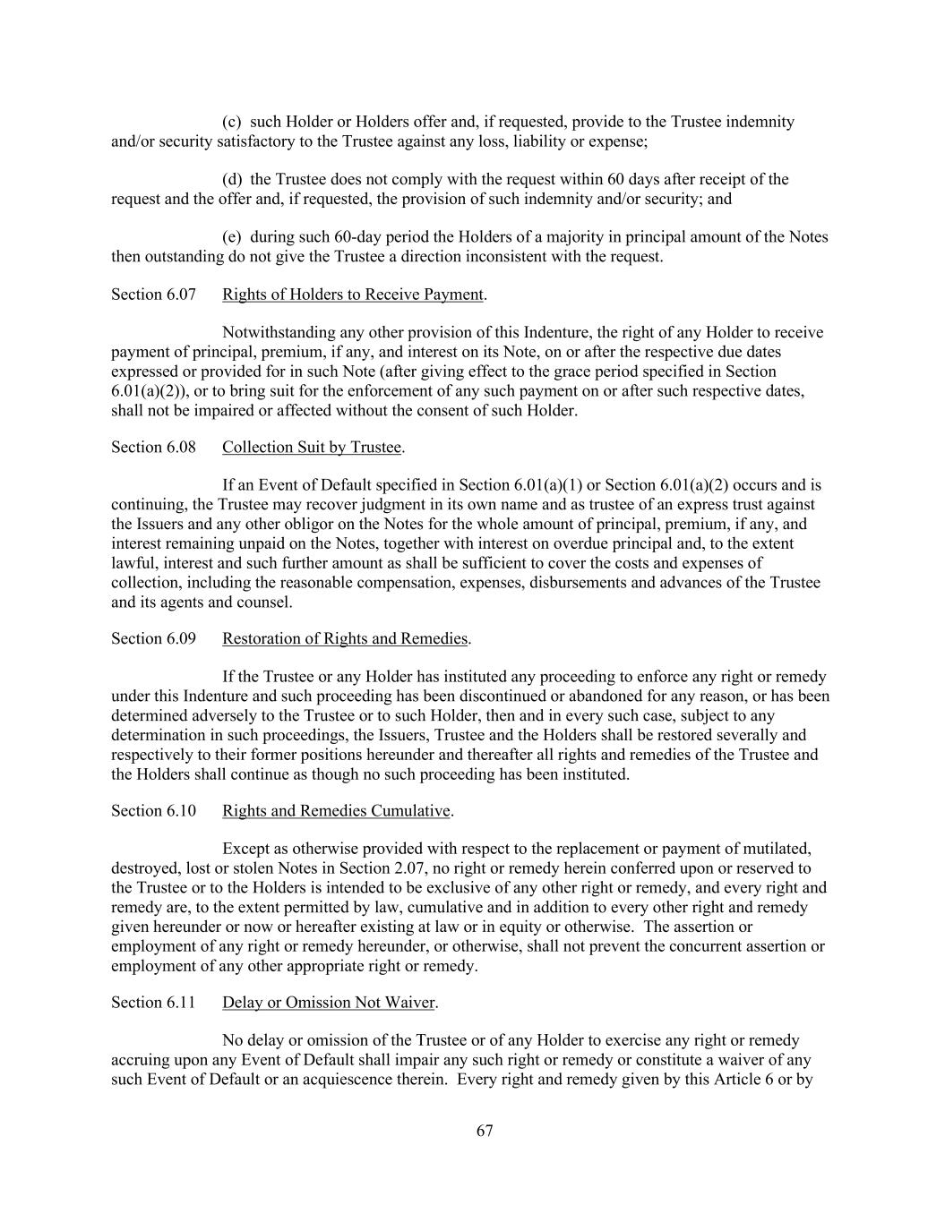67(c)该等持有人或持有人提出要约,并在提出要求时向受托人提供受托人对任何损失、责任或费用感到满意的赔偿和/或担保;(d)受托人在收到请求和要约后60天内没有遵守该请求,如果提出要求,也没有提供此类赔偿和/或担保;(e)在该60天期间,当时未偿还票据本金多数的持有人没有向受托人发出与该请求不一致的指示。第6.07款持有人的收款权利。尽管本契约另有任何规定,任何持有人在该票据明示或规定的相应到期日或之后(在第6.01(a)(2)条指明的宽限期生效后)收取其票据的本金、溢价(如有)及利息的权利,或在该相应日期或之后提起强制执行任何该等付款的诉讼的权利,未经该持有人同意,不得受到损害或影响。第6.08条受托人的催收诉讼。如第6.01(a)(1)条或第6.01(a)(2)条指明的违约事件发生且仍在继续,受托人可以自己的名义和作为明示信托的受托人,就票据上的本金、溢价(如有)及剩余未付利息的全部金额,连同逾期本金的利息,以及在合法范围内的利息和足以支付催收成本和费用的进一步金额,包括合理的赔偿、费用、受托人及其代理人和法律顾问的付款和垫款。第6.09节恢复权利和补救办法。如受托人或任何持有人已提起任何程序以强制执行本契约项下的任何权利或补救措施,而该等程序已因任何理由中止或放弃,或已被裁定对受托人或该等持有人不利,则在每宗该等情况下,在该等程序作出任何裁定的规限下,发行人、受托人及持有人须分别恢复其在本协议项下的先前地位,其后,受托人及持有人的所有权利及补救措施须继续,犹如并无提起该等程序一样。第6.10节权利和救济累计。除第2.07节中关于替换或支付残缺、毁损、遗失或被盗票据的另有规定外,本文赋予或保留给受托人或持有人的任何权利或补救办法均无意排除任何其他权利或补救办法,并且在法律允许的范围内,每项权利和补救办法都是累积的,并且是除根据本协议或现在或以后在法律上或在公平或其他方面存在的每项其他权利和补救办法之外的。主张或使用本协议项下的任何权利或补救办法,或其他方式,不应阻止同时主张或使用任何其他适当的权利或补救办法。第6.11节延迟或遗漏不放弃。受托人或任何持有人在行使因任何违约事件而产生的任何权利或补救措施方面的任何延迟或疏忽,均不得损害任何该等权利或补救措施,或构成对任何该等违约事件的放弃或对该等违约事件的默许。第6条给予的一切权利和补救或由