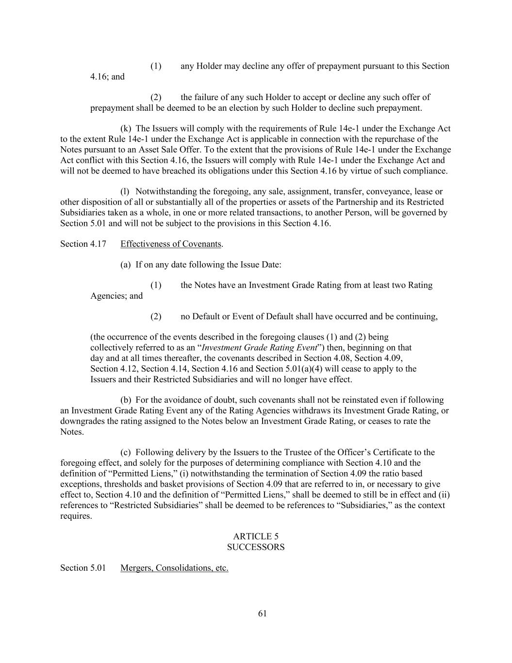 61(1)任何持有人可依据本条第4.16条拒绝任何预付要约;及(2)任何该等持有人未能接受或拒绝任何该等预付要约,须当作该持有人选择拒绝该等预付。(k)发行人将遵守《交易法》第14e-1条的要求,但以《交易法》第14e-1条适用于根据资产出售要约回购票据为限。如果《交易法》第14e-1条的规定与本第4.16条相冲突,发行人将遵守《交易法》第14e-1条的规定,并且不会因此类遵守而被视为违反了其在本第4.16条下的义务。(l)尽管有上述规定,在一项或多项有关交易中向另一人出售、转让、转让、转易、租赁或以其他方式处分合伙企业及其受限制附属公司作为一个整体的全部或实质上全部财产或资产,将受第5.01条规管,并不受本条第4.16条条文规限。第4.17节盟约的效力。(a)如果在发行日期之后的任何日期:(1)票据获得至少两家评级机构的投资级评级;(2)没有发生违约或违约事件,并且仍在继续,(前述第(1)和(2)条所述事件的发生统称为“投资级评级事件”),则从该日开始并在其后的所有时间,根据第4.08条、第4.09条、第4.12条、第4.14条所述的契诺,第4.16条和第5.01(a)(4)条不再适用于发行人及其受限子公司,不再有效。(b)为免生疑问,即使在发生投资级评级事件后,任何评级机构撤回其投资级评级,或将授予票据的评级下调至低于投资级评级,或停止对票据进行评级,该等契诺亦不得恢复。(c)在发行人向受托人交付具有上述效力的高级职员证书后,仅为确定遵守第4.10条和“许可留置权”定义的目的,(i)尽管第4.09条已终止,但第4.10条和“许可留置权”定义中提及或为实现该定义所必需的基于比率的例外、阈值和第4.09条的篮子规定应被视为仍然有效,并且(ii)提及“受限子公司”应视上下文要求视为提及“子公司”。第五条接盘者第5.01节合并、合并等