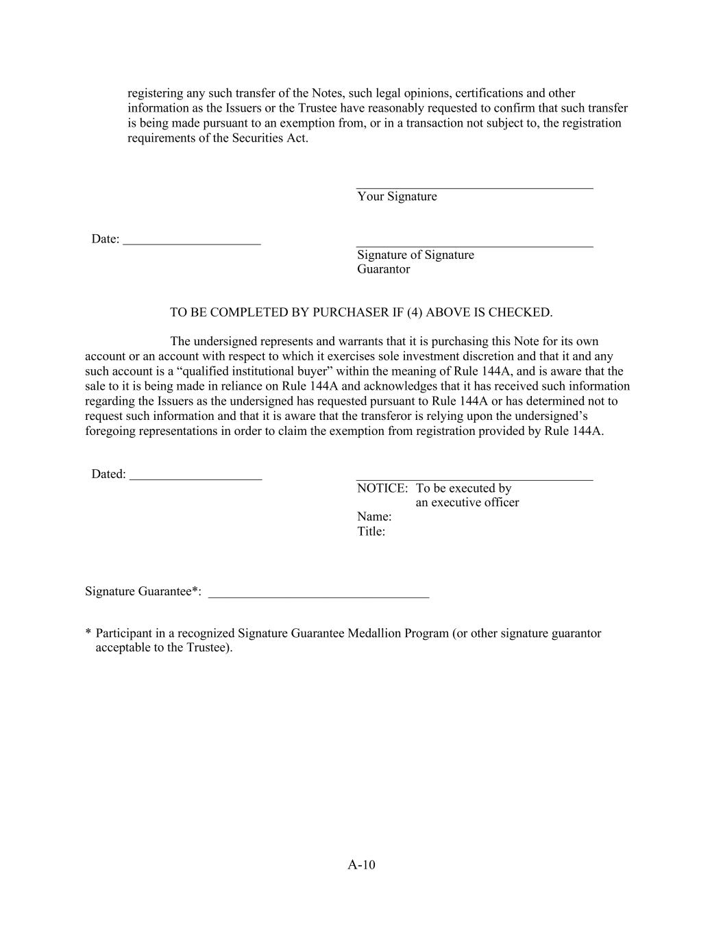 A-10登记票据的任何此类转让、发行人或受托人合理要求确认此类转让是根据《证券法》登记要求的豁免进行的或在不受《证券法》登记要求约束的交易中进行的法律意见、证明和其他信息。您的签字日期:签字保证人签字待购货人完成如果选中了以上(4)项。以下签署人声明并保证,其为自己的账户或其行使单独投资酌情权的账户购买本票据,且其和任何该等账户为规则144A所指的“合格机构买方”,并且知道向其出售是依据规则144A进行的,并承认其已收到以下签署人根据规则144A要求的有关发行人的信息或已确定不要求提供此类信息,并且其知道转让人正在依赖以下签署人的上述陈述以主张规则144A提供的登记豁免。日期:通知:拟由执行人员执行姓名:标题:签字保证*: __________________________________*参与经认可的签名保证奖章计划(或受托人可接受的其他签名担保人)。