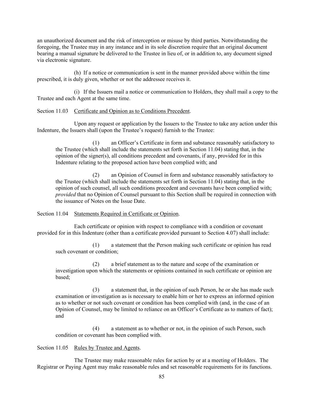 85未经授权的文件以及被第三方拦截或滥用的风险。尽管有上述规定,受托人可在任何情况下并在其唯一酌情权下要求将带有人工签字的原始文件交付给受托人,以代替或补充通过电子签字签署的任何文件。(h)如在规定的时间内以上述规定的方式发出通知或通信,则不论收件人是否收到,均已妥为发出。(i)发行人向持有人邮寄通知或通讯的,应当同时将一份副本邮寄给受托人和各代理人。第11.03节关于条件先例的证明和意见。发行人向受托人提出根据本指引采取任何行动的任何要求或申请,发行人须(应受托人的要求)向受托人提供:(1)一份形式及实质合理上令受托人满意的高级人员证明书(其中须包括第11.04条所载的陈述),述明在签署人看来,所有先决条件及契诺(如有),本指引就建议行动订定的条文已获遵从;及(2)大律师在形式及实质上合理上令受托人满意的意见(其中须包括第11.04条所列的陈述),述明该大律师认为,所有该等先决条件及契诺均已获遵从;但就发行日期的票据发行而言,无须根据本条提供大律师意见。第11.04节证书或意见中要求的陈述。有关遵守本指引所订定的条件或契诺的每份证明书或意见(依据第4.07条提供的证明书除外),须包括:(1)作出该证明书或意见的人已阅读该契诺或条件的陈述;(2)关于该证明书或意见所载的陈述或意见所依据的审查或调查的性质及范围的简短陈述;(3)该人认为,他或她已作出所需的审查或调查,以使他或她能够就该等契诺或条件是否已获遵从发表知情意见(如属大律师意见,则可限于就事实事项依赖高级人员证明书);及(4)就该人认为该等条件或契诺是否已获遵从而作出的陈述。第11.05节受托人和代理人规则。受托人可以为持有人会议或在持有人会议上采取行动制定合理的规则。书记官长或付款代理人可以对其职能制定合理的规则和设定合理的要求。