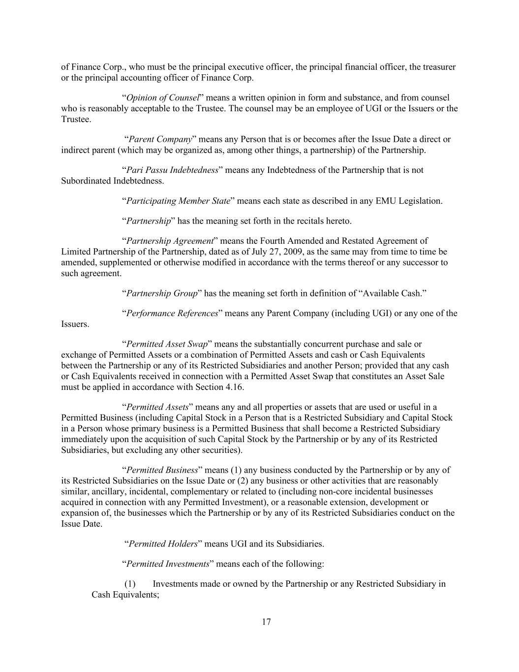 Finance Corp.的17,必须是Finance Corp.的首席执行官、首席财务官、司库或首席会计官。“大律师意见”是指形式和实质上的书面意见,来自受托人合理接受的大律师。大律师可以是UGI的雇员,也可以是发行人或受托人。“母公司”指在发行日期后成为或成为合伙企业的直接或间接母公司(其中可组织为合伙企业)的任何人。“Pari Passu债务”是指合伙企业的任何不属于次级债务的债务。“参与成员国”是指任何动车组立法中所描述的每个州。“伙伴关系”具有在本协议的独奏会中阐述的含义。“合伙协议”指合伙企业的第四份经修订及重述的有限合伙协议,日期为2009年7月27日,该协议可不时根据协议条款或该协议的任何承继人作出修订、补充或以其他方式作出修订。“合伙集团”具有“可用现金”定义中规定的含义。“业绩参考书”是指任何一家母公司(包括UGI)或发行人中的任何一家。“许可资产互换”是指合伙企业或其任何受限制子公司与另一人之间实质上同时购买和出售或交换许可资产或许可资产与现金或现金等价物的组合;但就构成资产出售的许可资产互换收到的任何现金或现金等价物必须根据第4.16节适用。“许可资产”是指在许可业务中使用或有用的任何和所有财产或资产(包括作为受限制子公司的人的股本和主要业务为许可业务的人的股本,在合伙企业或其任何受限制子公司获得该股本后应立即成为受限制子公司,但不包括任何其他证券)。“许可业务”指(1)合伙企业或其任何受限制子公司在发行日开展的任何业务或(2)与合伙企业或其任何受限制子公司在发行日开展的业务合理相似、附属、附带、补充或相关的任何业务或其他活动(包括就任何许可投资而获得的非核心附带业务),或合理的扩展、发展或扩张。“许可持有人”是指UGI及其子公司。“许可投资”指以下各项:(1)合伙企业或任何受限制子公司以现金等价物作出或拥有的投资;
