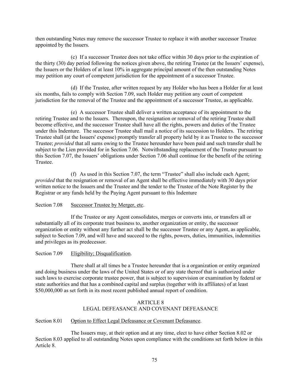 75然后未偿还票据可以解除继任受托人的职务,以由发行人指定的另一位继任受托人取而代之。(c)如继任受托人在上述通知发出后的三十(30)天期限届满前30天内未就任,则退任受托人(由发行人负担费用)、发行人或当时未偿还票据本金总额至少10%的持有人可向任何有管辖权的法院申请委任继任受托人。(d)如受托人在任何已身为持有人至少六个月的持有人提出书面要求后,没有遵从第7.09条,则该持有人可向任何具有主管司法管辖权的法院提出呈请,要求撤销该受托人及委任一名继任受托人(如适用)。(e)继任受托人须将其委任的书面接受书交付退任受托人及发行人。因此,退任受托人的辞职或免职即生效,继任受托人应享有受托人在本契约下的所有权利、权力和义务。继任受托人应当向持有人邮寄继任通知。退任受托人应(由发行人承担费用)迅速将其作为受托人持有的所有财产转移给继任受托人;但根据本协议欠受托人的所有款项已支付,且此种转移须遵守第7.06条规定的留置权。尽管根据本条第7.07款更换了受托人,但发行人根据第7.06款承担的义务应继续为即将退休的受托人的利益服务。(f)如本条第7.07条所使用,“受托人”一词亦应包括每名代理人;但代理人的辞职或免职须立即生效,并须提前30天向发行人和受托人发出书面通知,以及由注册处处长向票据登记册的受托人或付款代理人根据本义齿第7.08条以合并方式持有的任何资金的承继受托人等作出投标。如受托人或任何代理人将其全部或实质上全部公司信托业务合并、合并或转换为另一组织或实体,或将其全部或实质上全部公司信托业务转让予另一组织或实体,则该继承组织或实体应为继任受托人或任何代理人(如适用),但须受第7.09条规限,并将拥有并继承作为其前身的权利、权力、义务、豁免、赔偿和特权。第7.09节资格;取消资格。在任何时候,本协议下的受托人都应是根据美国或其任何州的法律组织和开展业务的组织或实体,该组织或实体根据此类法律被授权行使公司受托人权力,受联邦或州当局的监督或审查,并且其最近公布的年度状况报告中规定的资本和盈余(连同其关联公司)合计至少为50,000,000美元。第8条法律抗辩和《盟约》抗辩第8.01节实施法律抗辩或《盟约抗辩》的选择权。发行人可以选择在符合本条第8条规定的下述条件时,随时选择将第8.02条或第8.03条适用于所有未偿票据。