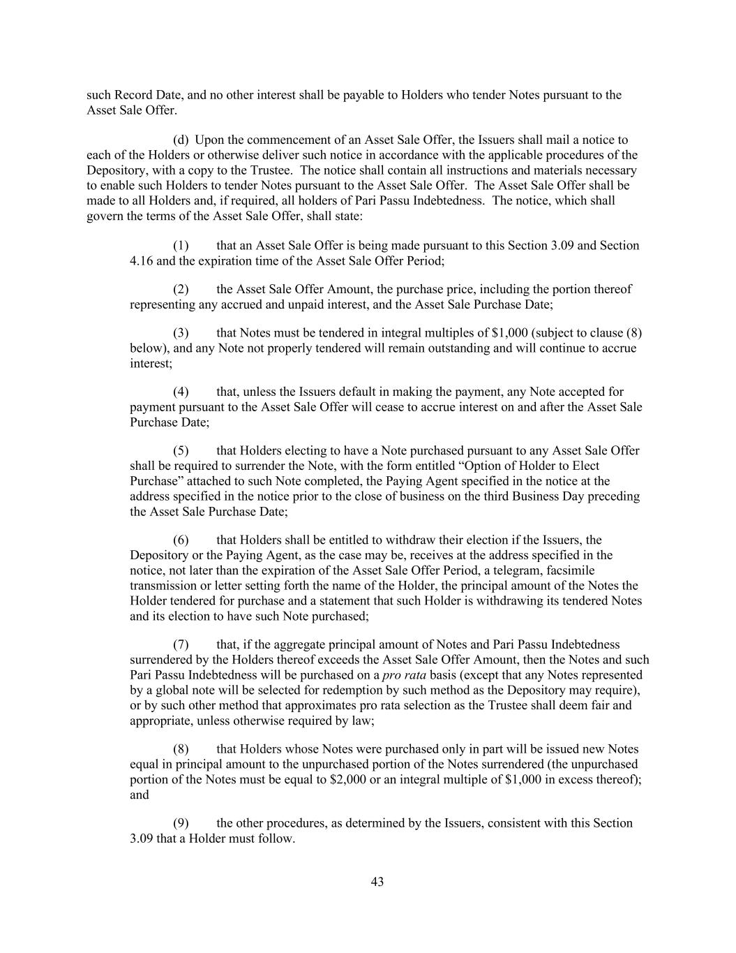 43该记录日期,且不得向根据资产出售要约投标票据的持有人支付任何其他利息。(d)资产出售要约开始时,发行人应按照存管人的适用程序向每一持有人邮寄通知或以其他方式交付该通知,并将一份副本送交受托人。该通知应包含所有必要的指示和材料,以使此类持有人能够根据资产出售要约投标票据。资产出售要约应向所有持有人提出,如有要求,应向Pari Passu债务的所有持有人提出。该通知适用于资产出售要约的条款,该通知应说明:(1)正在根据本条第3.09条和第4.16条提出资产出售要约以及资产出售要约期的到期时间;(2)资产出售要约金额、购买价格,包括其代表任何应计和未付利息的部分,以及资产出售购买日期;(3)票据必须以1,000美元的整数倍投标(受下文第(8)款规限),及任何未适当投标的票据将继续未偿还,并将继续产生利息;(4)除非发行人拖欠付款,否则根据资产出售要约接受付款的任何票据将于资产出售日期及之后停止产生利息;(5)选择根据任何资产出售要约购买票据的持有人应被要求交出该票据,并填写该票据所附的题为“持有人选择购买的选择权”的表格,(六)发行人、存管人或者付款代理人(视情况而定)不迟于资产出售要约期届满时在通知规定的地址收到载明持有人名称的电报、传真或者信函的,持有人有权撤回其选择,持有人投标购买的票据的本金金额,以及该持有人正在撤回其投标的票据及其选择购买该票据的声明;(7)如票据持有人交出的票据及Pari Passu债务的本金总额超过资产出售要约金额,则票据及该Pari Passu债务将按比例购买(但全球票据所代表的任何票据将按存管人可能要求的方法选择赎回除外),或采用受托人认为公平和适当的近似按比例选择的其他方法,除非法律另有规定;(8)其票据仅被部分购买的持有人将被发行本金等于所交回的票据的未购买部分的新票据(票据的未购买部分必须等于2,000美元或超过其1,000美元的整数倍);(9)由发行人确定的、持有人必须遵循的与本条3.09一致的其他程序。