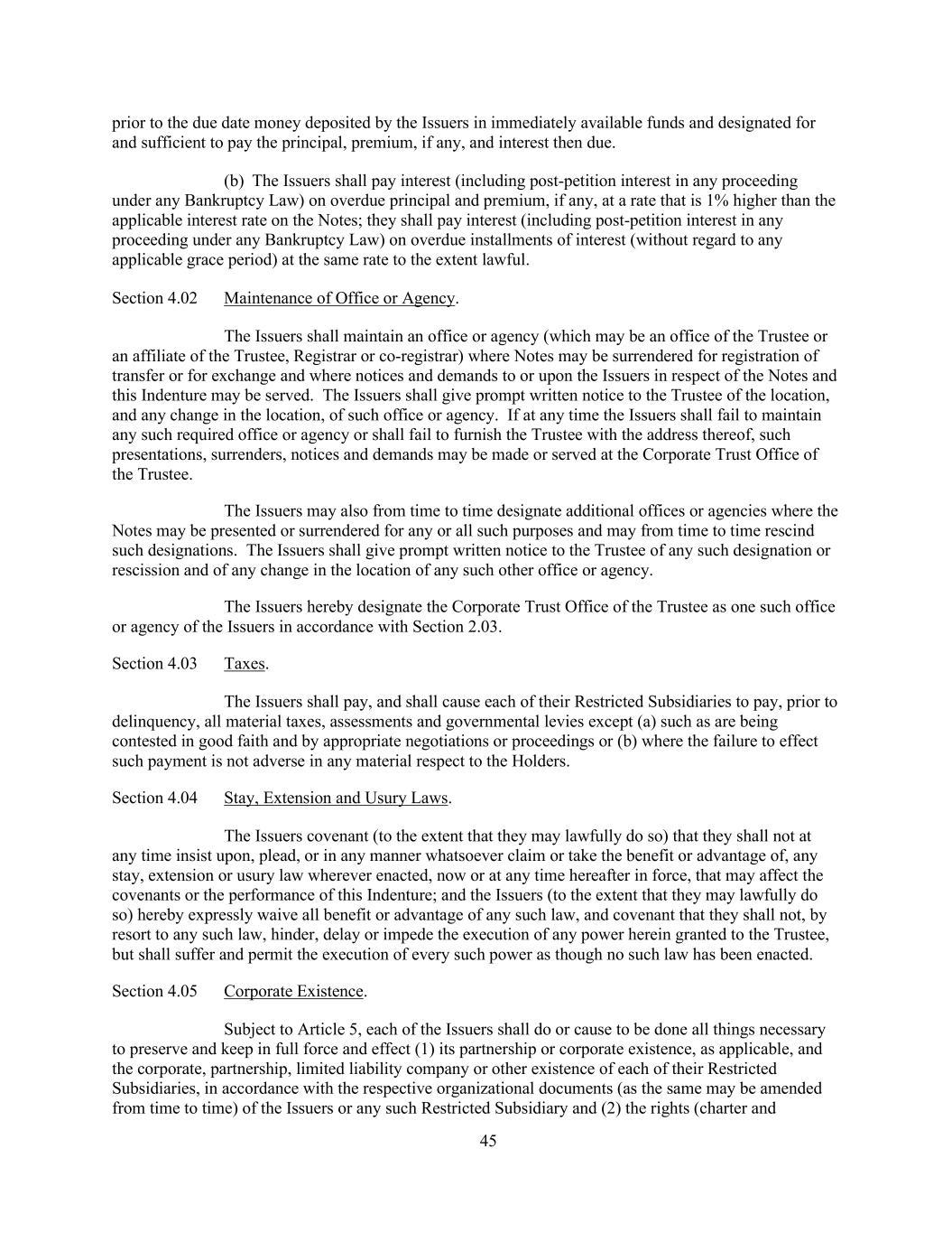 45在到期日之前由发行人存入即时可用资金并指定用于并足以支付届时到期的本金、溢价(如有)和利息的款项。(b)发行人应按高于票据适用利率1%的利率支付逾期本金和溢价(如有)的利息(包括根据任何破产法进行的任何程序的请愿后利息);他们应在合法范围内按相同利率支付逾期分期利息(不考虑任何适用的宽限期)的利息(包括根据任何破产法进行的任何程序的请愿后利息)。第4.02节办公室或机构的维护。发行人须维持一个办事处或代理机构(可为受托人的办事处或受托人、注册处处长或共同注册处处长的联属公司),在该办事处或代理机构可将票据交还以作转让登记或交换,并可就票据及本义齿向发行人送达或向发行人送达通知及要求。发行人应当及时向受托人书面通知该办事处或代理机构的所在地,以及所在地的任何变更。如发行人在任何时候未能维持任何该等规定的办事处或代理机构或未能向受托人提供其地址,则可在受托人的公司信托办公室作出或送达该等陈述、退保、通知及要求。发行人还可不时指定额外的办事处或机构,在这些办事处或机构可为任何或所有此类目的出示或交出票据,并可不时撤销此类指定。发行人应就任何该等指定或撤销以及任何该等其他办事处或机构的地点发生任何变更及时向受托人发出书面通知。发行人特此指定受托机构公司信托办公室为发行人的一个此类办公室或机构,按照第2.03节的规定。第4.03节税收。发行人应支付,并应促使其每个受限制子公司在拖欠之前支付所有重大税款、评估和政府征费,但(a)如出于善意和通过适当的谈判或程序提出争议,或(b)如果未能支付此类款项在任何重大方面对持有人没有不利影响,则除外。第4.04节中止、延期和高利贷法。发行人承诺(在他们可以合法地这样做的范围内),他们不得在任何时候坚持、抗辩,或以任何方式主张或利用任何已在任何地方颁布的、现在或以后任何时间有效的、可能影响本契约或履行本契约的任何中止、延期或高利贷法的利益或优势;发行人(在他们可以合法地这样做的范围内)特此明确放弃任何该等法律的所有利益或优势,并承诺他们不得通过诉诸任何该等法律来阻碍,延迟或阻碍执行本条例授予受托人的任何权力,但须承受并准许执行每一项该等权力,犹如并无订立该等法律一样。第4.05节公司存在。在不违反第五条的情况下,各发行人应根据发行人或任何该等受限制附属公司各自的组织文件(可能不时修订)及(2)权利(章程及