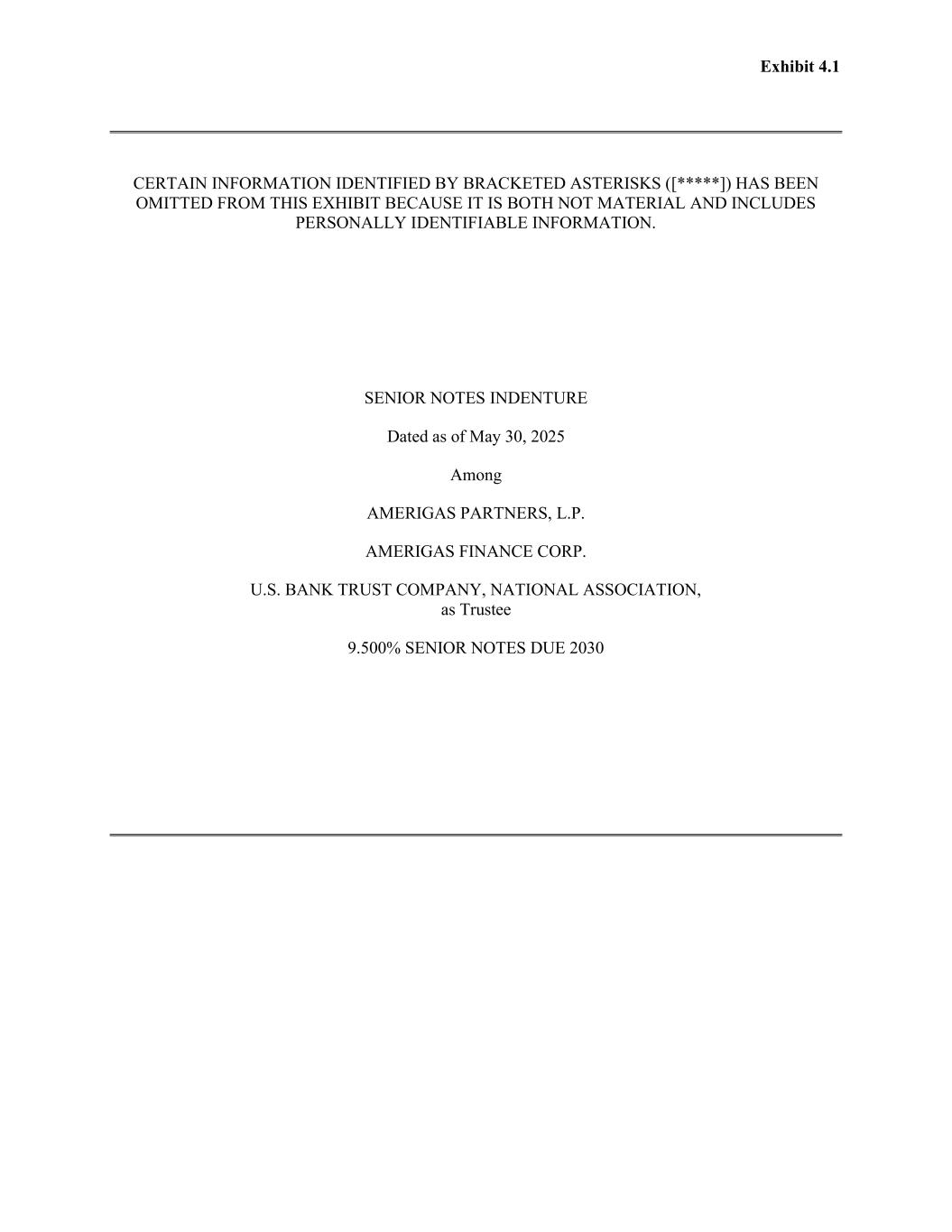 附件 4.1通过括号内的星号识别的某些信息([*****])已被从本展览中省略,因为它既不是实质性的,也包括个人可识别的信息。AMERIGAS合作伙伴,L.P. AMERIGAS Finance CORP中的高级票据契约日期为2025年5月30日。美国银行信托公司,美国国家协会,作为受托人,2030年到期的9.500%高级票据