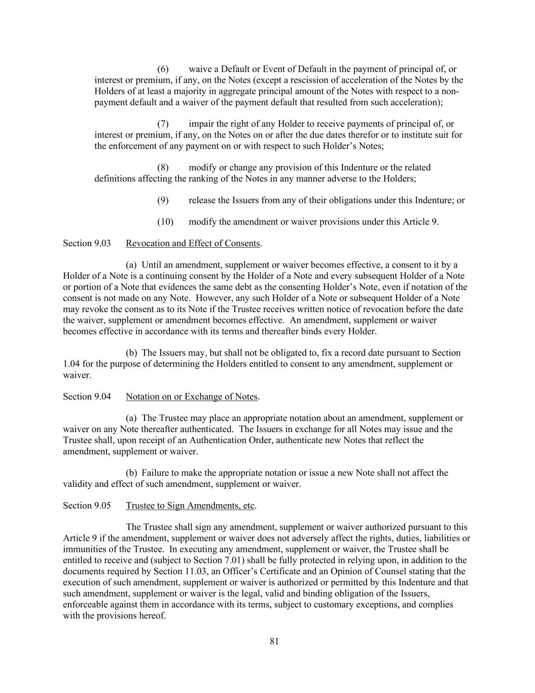 81(6)放弃票据本金或利息或溢价(如有)的支付方面的违约或违约事件(但票据本金总额至少过半数的持有人就未支付违约撤销票据加速支付以及因该加速支付而导致的对付款违约的放弃除外);(7)损害任何持有人收取本金或利息或溢价(如有)的付款的权利,在到期日或之后的票据上,或就强制执行该持有人票据的任何付款提起诉讼;(8)以对持有人不利的任何方式修改或更改本契约的任何条款或影响票据排名的相关定义;(9)解除发行人在本契约下的任何义务;或(10)根据本条第9款修改修订或放弃条款。第9.03节同意书的撤销和效力。(a)在修订、补充或放弃生效之前,票据持有人对其的同意是票据持有人和票据的每一后续持有人的持续同意,证明与同意持有人票据相同的债务,即使未在任何票据上注明同意。然而,如受托人在放弃、补充或修订生效日期之前收到书面撤销通知,则任何该等票据持有人或票据的其后持有人可撤销对其票据的同意。修订、补充或放弃根据其条款生效,其后对每名持有人具有约束力。(b)发行人可以但无义务根据第1.04条确定记录日期,以确定有权同意任何修订、补充或放弃的持有人。第9.04节票据上的记号或交换。(a)受托人可在其后认证的任何票据上放置有关修订、补充或放弃的适当标记。发行人以交换所有票据可发行,而受托人在收到认证令后,须认证反映修订、补充或放弃的新票据。(b)未能作出适当的注明或发出新的说明,不影响该等修订、补充或放弃的有效性及效力。第9.05条受托人签署修订等受托人应当签署依据第九条授权的任何修改、补充或者放弃,其修改、补充或者放弃不对受托人的权利、义务、责任或者豁免产生不利影响的。在执行任何修订、补充或放弃时,除第11.03条所要求的文件外,受托人有权获得并(在符合第7.01条的规定下)获得充分保护,此外,受托人还依赖一份高级职员证书和一份律师意见,其中说明执行此类修订、补充或放弃是本义齿授权或允许的,并且此类修订、补充或放弃是发行人的合法、有效和具有约束力的义务,可根据其条款对其强制执行,但习惯例外情况除外,并符合本协议的规定。