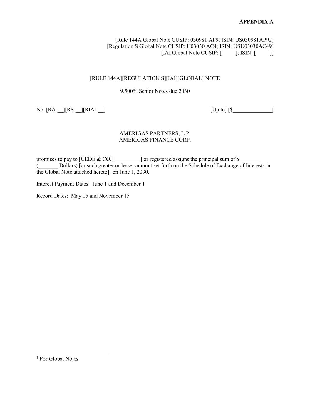 附录A【规则144A全球票据CUSIP:030981 AP9;ISIN:US030981AP92】[条例S全球票据CUSIP:U03030 AC4;ISIN:USU03030AC49 ] [ CUSIP:[ ];ISIN:[ ] ] [规则144a ] [条例S ] [ IAI ] [ Global ] NOTE 9.500%于2030年到期的优先票据第[ RA-__ ] [ RS-__ ] [ RIAI-__ ] [最高] [ $ ______________ ] AMERIGAS PARTNERS,L.P. AMERIGAS FINANCE CORP.承诺于2030年6月1日向[ CEDE & CO. ] [ __________ ]或注册转让本金金额为$ ________(________美元)[或本协议所附全球票据的权益交换附表中所列的更多或更少的金额] 1。付息日期:6月1日和12月1日记录日期:5月15日和11月15日1为全球票据。