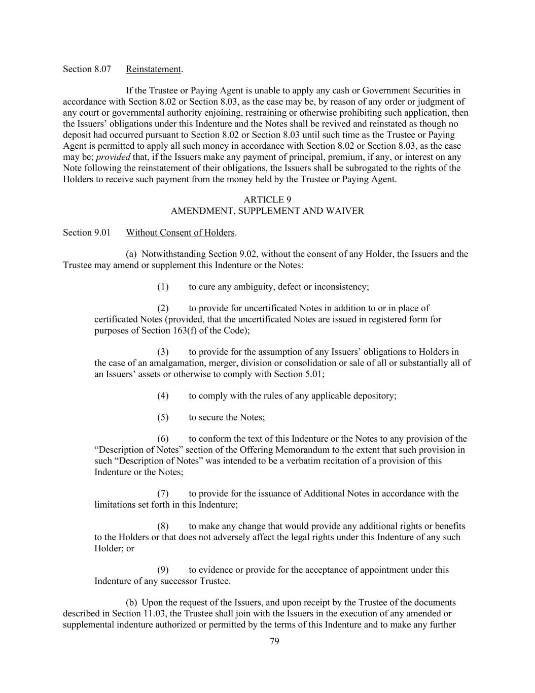 79第8.07节恢复原状。如受托人或付款代理人不能根据第8.02条或第8.03条(视属何情况而定)申请任何现金或政府证券,原因是任何法院或政府当局的任何命令或判决禁止、限制或以其他方式禁止该等申请,则发行人在本契约及票据下的义务须恢复及恢复,犹如根据第8.02条或第8.03条并无发生存款一样,直至受托人或付款代理人获准根据第8.02条或第8.03条(视属何情况而定)运用所有该等款项为止;但如发行人在其义务恢复后就任何票据支付任何本金、溢价(如有的话)或利息,发行人应代位行使持有人从受托人或付款代理人持有的款项中收取该款项的权利。第九条未经持有人同意,修正、补充和放弃第9.01款。(a)尽管有第9.02条的规定,未经任何持有人同意,发行人及受托人可修订或补充本契约或票据:(1)以纠正任何模棱两可、缺陷或不一致之处;(2)规定在已证明票据之外或代替已证明票据(条件是,就《守则》第163(f)条而言,未证明票据以注册形式发行);(3)规定在合并、合并的情况下承担任何发行人对持有人的义务,将发行人的全部或基本全部资产进行分割、合并或出售,或以其他方式遵守第5.01条;(4)遵守任何适用的存管机构的规则;(5)为票据提供担保;(6)使本义齿或票据的文本符合发售备忘录“票据说明”部分的任何规定,前提是该等“票据说明”中的该等规定旨在逐字背诵本契约或票据的某一规定;(7)规定根据本契约规定的限制发行附加票据;(8)作出将为持有人提供任何额外权利或利益或不对任何该等持有人在本契约下的合法权利产生不利影响的任何变更;或(9)证明或规定接受任何继任受托人在本契约下的委任。(b)应发行人的要求,并在受托人收到第11.03条所述文件后,受托人应与发行人一起执行本契约条款授权或允许的任何经修订或补充契约,并作出任何进一步