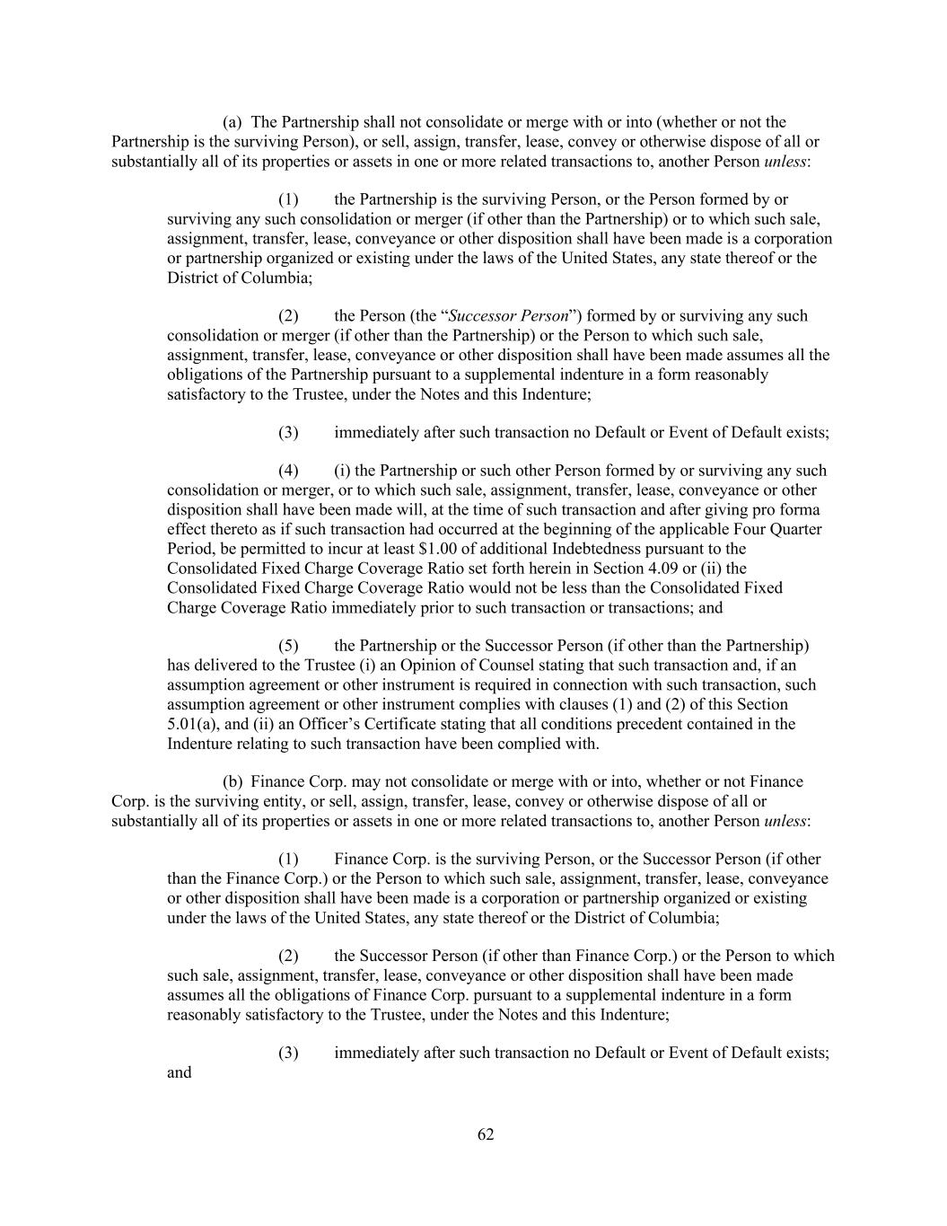 62(a)合伙企业不得与另一人合并或合并(不论该合伙企业是否为存续人),或将其在一项或多项相关交易中的全部或基本全部财产或资产出售、转让、转让、出租、转让或以其他方式处置予另一人,除非:(1)该合伙企业为存续人,或由任何该等合并或合并所组成或存续的人(如该合伙企业除外),或该等出售、转让、转让、租赁所针对的人,已作出转易或其他处分的,应为根据美国、美国任何州或哥伦比亚特区的法律组织或存在的公司或合伙企业;(2)任何该等合并或合并所组成或存续的人(如合伙企业除外)或已作出该等出售、转让、转让、租赁、转易或其他处分的人,应以受托人合理满意的形式,根据补充契约承担合伙企业的所有义务,(3)紧接该等交易后不存在违约或违约事件;(4)(i)由任何该等合并或合并组成或存续的合伙企业或该等其他人,或已作出该等出售、转让、转让、租赁、转易或其他处置的合伙企业或该等其他人,在该等交易发生时,并在给予该等交易形式上的效力后,犹如该等交易已在适用的第四季度期间开始时发生,被允许根据本文第4.09节中规定的合并固定费用覆盖率承担至少1.00美元的额外债务,或(ii)合并固定费用覆盖率将不低于紧接此类交易或交易之前的合并固定费用覆盖率;(5)合伙企业或继任者(如果不是合伙企业)已向受托人(i)提交律师意见,说明此类交易,并且,如果与此类交易相关需要承担协议或其他文书,该假设协议或其他文书符合本条第5.01(a)条第(1)及(2)款,及(ii)高级人员证明书,述明与该交易有关的指引所载的所有先决条件均已获遵从。(b)财务公司不得与另一人合并或合并,不论财务公司是否为存续实体,或向另一人出售、转让、转让、租赁、转让或以其他方式处置其在一项或多项相关交易中的全部或基本全部财产或资产,除非:(1)财务公司为存续人,或继承人(如财务公司除外)或此类出售、转让、转让、租赁的人,已作出转易或其他处分的,应是根据美国、其任何州或哥伦比亚特区的法律组织或存在的公司或合伙企业;(2)继承人(如果不是Finance Corp.)或作出此类出售、转让、转让、租赁、转易或其他处分的人,应已根据补充契约以受托人合理满意的形式承担Finance Corp.在票据和本契约下的所有义务;(3)在紧接此类交易后不存在违约或违约事件;和