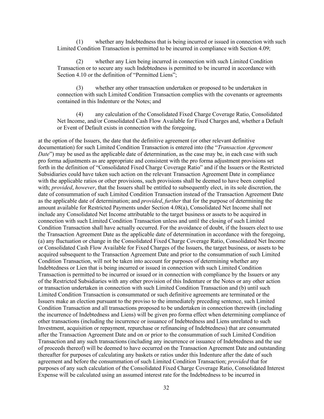 32(1)是否有负债根据第4.09条,就该等有限条件交易而正在招致或发出的,获准招致;(2)是否根据第4.10条或“准许留置权”的定义,准许就该等有限条件交易或为担保任何该等债务而招致的任何留置权;(3)就该等有限条件交易而进行或拟进行的任何其他交易,是否符合本契约或票据所载的契诺或协议;(4)任何关于可用于固定费用的综合固定费用覆盖率、综合净收入和/或综合现金流量的计算,以及发行人可选择是否存在与上述有关的违约或违约事件,可将就该有限条件交易订立最终协议(或其他相关最终文件)的日期(“交易协议日期”)(视情况而定)作为适用的确定日期,在每一种情况下,进行适当且符合“合并固定费用覆盖率”定义中规定的备考调整条款的备考调整,如果发行人或受限制子公司本可以在相关交易协议日期按照适用的比率或其他规定采取该等行动,则该等规定应被视为已得到遵守;但条件是,发行人有权随后自行决定选择,该有限条件交易的完成日期而非交易协议日期作为适用的确定日期;并进一步规定,为确定根据第4.08(a)节可用于限制性付款的金额,合并净收益不应包括与该有限条件交易相关的归属于目标业务或将收购的资产的任何合并净收益,除非且直至该有限条件交易的完成应已实际发生。为免生疑问,如发行人根据前述规定选择以交易协议日期作为适用的确定日期,(a)发行人、标的业务、或拟收购资产的合并固定费用覆盖率、合并净收益或可用于固定费用的合并现金流量在交易协议日期之后和该有限条件交易完成之前的任何波动或变化,将不会被考虑以确定是否有任何债务或留置权就该等有限条件交易而正在招致或发行的,获准招致或发行或与发行人或任何受限制附属公司遵守本契约或票据的任何其他条文或就该等有限条件交易而进行的任何其他行动或交易有关,及(b)直至该等有限条件交易完成或该等最终协议终止或发行人根据紧接前一句的但书作出选择,在确定其他交易(包括与该投资、收购或偿还无关的债务和留置权的发生或发行)的合规性时,将对该有限条件交易以及与此相关的所有拟议进行的交易(包括产生债务和留置权)给予形式上的效力,回购或债务再融资)在交易协议日期之后以及在该有限条件交易完成时或之前完成以及任何该等交易(包括任何债务的产生或发行及其收益的使用)将被视为已在交易协议日期发生并在其后未完成,以便在该协议日期之后和该有限条件交易完成前计算本契约下的任何篮子或比率;但就任何该等计算综合固定费用覆盖率而言,合并利息费用将使用拟发生债务的假定利率计算
