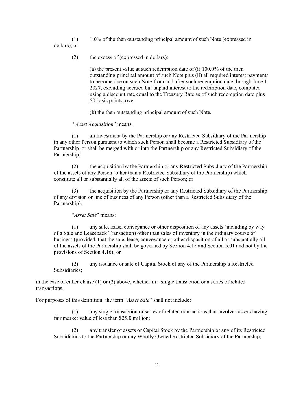 2(1)该票据当时未偿还本金额的1.0%(以美元表示);或(2)超出部分(以美元表示):(a)于该赎回日期的现值(i)该票据当时未偿还本金额的100.0%加上(ii)自该赎回日期及之后至2027年6月1日该票据到期的所有规定利息付款,不包括截至赎回日期的应计但未付利息,计算时使用的贴现率等于截至该赎回日的国库券利率加上50个基点;超过(b)该票据当时未偿还的本金金额。“资产收购”是指,(1)合伙企业或合伙企业的任何受限制子公司对任何其他人的投资,据此,该人应成为合伙企业的受限制子公司,或应与合伙企业或合伙企业的任何受限制附属公司合并或并入;(2)合伙企业或合伙企业的任何受限制附属公司收购构成该人全部或实质上全部资产的任何人(合伙企业的受限制附属公司除外)的资产;或(3)合伙企业或合伙企业的任何受限制附属公司收购任何人(合伙企业的受限制附属公司除外)的任何分部或业务范围。“资产出售”是指:(1)除在日常业务过程中出售存货外,任何资产的任何出售、租赁、转让或其他处置(包括通过售后回租交易的方式)(前提是合伙企业的全部或几乎全部资产的出售、租赁、转让或其他处置应受第4.15条和第5.01条的管辖,而不受第4.16条的规定管辖);或(2)任何合伙企业的任何受限制子公司的股本的任何发行或出售;在上述第(1)或(2)条的情况下,无论是在单一交易中还是在一系列关联交易中。就本定义而言,“资产出售”一词不应包括:(1)涉及公允市场价值低于25.0百万美元的资产的任何单一交易或系列相关交易;(2)合伙企业或其任何受限子公司向合伙企业或合伙企业的任何全资受限子公司转让资产或股本;