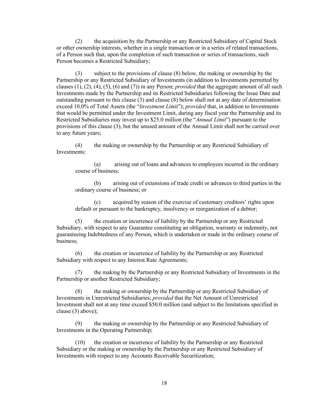 18(2)合伙企业或任何受限制的附属公司收购股本或其他所有权权益,不论是在单一交易中还是在一系列相关交易中,使该人在该交易或一系列交易完成后成为受限制的附属公司;(3)在符合下文第(8)条规定的情况下,合伙企业或任何受限制的附属公司作出或拥有投资(除第(1)、(2)、(4)、(5)条允许的投资外,(6)及(7))于任何人;但合伙企业及其受限制的附属公司在发行日期后作出且根据本第(3)条及下文第(8)条尚未偿还的所有该等投资的总额,在任何确定日期不得超过总资产的10.0%(“投资限额”);但除根据投资限额将被允许的投资外,在任何财政年度内,合伙企业及其受限制的附属公司可根据本第(3)条的规定投资最多2500万美元(“年度限额”),但年度限额的未使用金额不得结转至任何未来年度;(4)合伙企业或任何受限制的附属公司作出或拥有Investments:(a)因在正常业务过程中向雇员提供贷款和垫款而产生;(b)因在正常业务过程中向第三方提供贸易信贷或垫款而产生;或(c)因在违约时或根据破产行使习惯债权人权利而获得,债务人破产或重组;(5)合伙企业或任何受限制的子公司对构成义务、保证或赔偿的任何担保产生或产生责任,不保证任何人的债务,(6)合伙企业或任何受限制的附属公司就任何利率协议产生或产生责任;(7)合伙企业或任何受限制的附属公司对合伙企业或另一受限制的附属公司作出投资;(8)合伙企业或任何受限制的附属公司对非受限制的附属公司作出投资或拥有投资;提供非限制性投资的净额在任何时候均不得超过5000万美元(并受上文第(3)条规定的限制);(9)由合伙企业或任何受限制的子公司对经营合伙企业进行投资或拥有投资;(10)由合伙企业或任何受限制的子公司创建或产生责任,或由合伙企业或任何受限制的子公司就任何应收账款证券化进行投资或拥有投资;