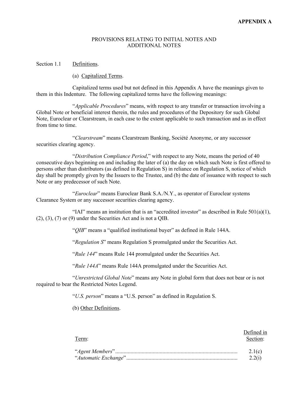 附录a与初始说明和附加说明有关的规定第1.1节定义。(a)大写术语。本附录A中使用但未定义的大写术语具有本义齿中赋予它们的含义。以下大写术语具有以下含义:“适用程序”是指,就涉及全球票据或其中实益权益的任何转让或交易而言,该全球票据、Euroclear或Clearstream的存管人的规则和程序,在每种情况下,在适用于该交易的范围内并不时生效。“Clearstream”是指Clearstream Banking、Soci é t é Anonyme或任何后续证券清算机构。就任何票据而言,“分销合规期”是指连续40天的期间,自(a)首次依据S条例向分销商以外的人(如S条例所定义)发售该票据之日起(包括其中较晚者)开始,发行人应迅速向受托人发出关于哪一天的通知,以及(b)就该票据或该票据的任何前身发行的日期。“Euroclear”是指Euroclear Bank S.A./N.Y.,作为Euroclear系统清算系统的运营商或任何后续证券清算机构。“IAI”是指根据《证券法》第501(a)(1)、(2)、(3)、(7)或(9)条属于“认可投资者”且不是QIB的机构。“QIB”是指规则144A中定义的“合格机构买方”。“S条例”是指根据《证券法》颁布的S条例。“第144条”是指根据《证券法》颁布的第144条。“第144A条”是指根据《证券法》颁布的第144A条。“不受限制的全球票据”是指不承担或不需要承担受限制票据图例的任何全球形式的票据。“美国人”是指条例S.(b)其他定义中定义的“美国人”。术语:定义于:“代理会员”........................................................................................ 2.1(c)“自动交换”........................................................................ 2.2(i)