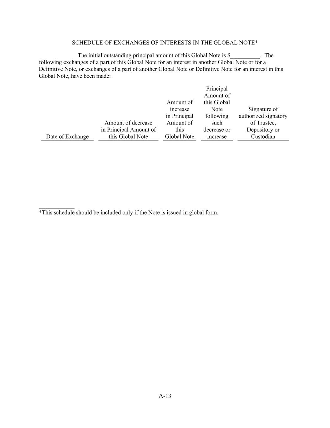 A-13全球票据利益交换时间表*这张全球票据的初始未偿本金金额为__________美元。以下将本全球票据的一部分交换为另一全球票据的权益或确定票据,或将另一全球票据的一部分或确定票据交换为本全球票据的权益,已作出:交换日期本全球票据本金金额减少额本全球票据本金金额在该等减少或增加后增加的授权签字人签署,存管人或保管人_____________*只有在票据以全球形式发行的情况下,才应列入这一时间表。