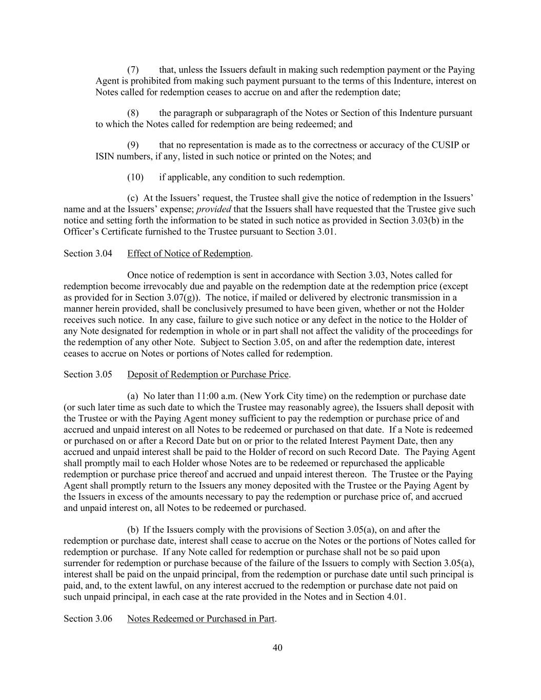 40(7)除非发行人未有作出该等赎回付款或付款代理根据本契约的条款被禁止作出该等付款,否则被要求赎回的票据的利息将于赎回日期及之后停止累积;(8)票据的段落或分段或本契约中要求赎回的票据所依据的部分;及(9)不就任何CUSIP或ISIN号码(如有)的正确性或准确性作出任何陈述,列于该通知内或印于票据上;及(10)如适用,有关该赎回的任何条件。(c)应发行人的要求,受托人须以发行人的名义发出赎回通知,费用由发行人承担;但发行人须已要求受托人发出该通知,并载明根据第3.01条向受托人提供的高级人员证书中第3.03(b)条所规定的通知中须述明的资料。第3.04节赎回通知的效力。一旦根据第3.03条发出赎回通知,要求赎回的票据将不可撤销地按赎回价格在赎回日期到期应付(第3.07(g)条规定的除外)。该通知,如以本协议规定的方式以电子传输方式邮寄或交付,则无论持有人是否收到该通知,均应被最终推定为已发出。在任何情况下,未能向任何指定作全部或部分赎回的票据的持有人发出该通知或通知中的任何瑕疵,均不影响任何其他票据的赎回程序的有效性。除第3.05条另有规定外,在赎回日期当日及之后,票据或被要求赎回的票据部分停止计息。第3.05节赎回或购买价款的定金。(a)不迟于赎回或购买日期(或受托人合理同意的日期)上午11时(纽约市时间),发行人须向受托人或付款代理存入足以支付于该日期将赎回或购买的所有票据的赎回或购买价款及应计及未付利息的款项。如果票据在记录日期或之后但在相关利息支付日或之前赎回或购买,则任何应计和未支付的利息应在该记录日期支付给记录持有人。付款代理人应及时将其适用的赎回或购买价格及其应计未付利息邮寄给拟赎回或回购票据的每一持有人。受托人或付款代理人应将发行人存放于受托人或付款代理人的任何款项,超过支付拟赎回或购买的所有票据的赎回或购买价款以及应计未付利息所需的金额,及时退还发行人。(b)如发行人遵守第3.05(a)条的规定,则在赎回或购买日期当日及之后,票据或被要求赎回或购买的票据部分将停止产生利息。如因发行人未能遵守第3.05(a)条而要求赎回或购买的任何票据在退还赎回或购买时不得如此支付,则须就未付本金支付利息,自赎回或购买日期起至支付该本金为止,并在合法范围内,就赎回或购买日期未就该未付本金支付的任何应计利息,在每种情况下均按票据和第4.01条规定的利率支付。第3.06节部分赎回或购买的票据。