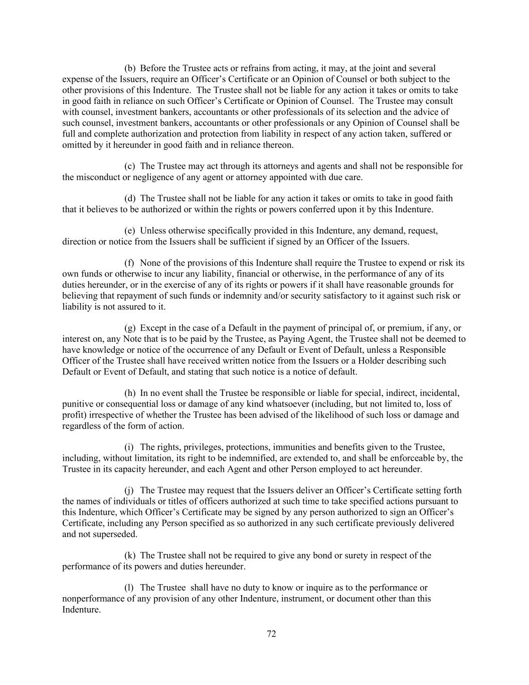 72(b)受托人在采取行动或不采取行动前,可在不违反本指引的其他条文的情况下,要求提供高级人员证明书或律师意见或两者兼备,费用由发行人共同承担。受托人无须对其依赖该高级人员的证明书或大律师的意见而善意采取或不采取的任何行动承担法律责任。受托人可咨询其选定的大律师、投资银行家、会计师或其他专业人士,而该等大律师、投资银行家、会计师或其他专业人士的意见或大律师的任何意见,均应是对其根据本协议善意并依赖其采取、遭受或遗漏的任何行动的充分和完整的授权和免于承担责任的保护。(c)受托人可透过其代理人及代理人行事,不得对任何经适当注意委任的代理人或代理人的不当行为或疏忽负责。(d)受托人无须对其认为已获授权或在本指引赋予其的权利或权力范围内善意采取或不采取的任何行动承担法律责任。(e)除非本指引另有具体规定,否则发行人的任何要求、要求、指示或通知,如由发行人的高级人员签署,即为足够。(f)如受托人有合理理由相信不能向其保证偿付其对该风险或责任感到满意的该等资金或弥偿及/或担保,则本契约的任何条文均不得要求受托人在履行其根据本契约所承担的任何职责或在行使其任何权利或权力时支出或承担自有资金或风险,或以其他方式承担任何财务或其他方面的责任。(g)除非受托人作为付款代理人须支付的任何票据的本金或溢价(如有的话)或利息的支付出现违约,否则受托人不得当作知悉或知悉任何违约或违约事件的发生,除非受托人的负责人员已收到发行人或持有人的书面通知,说明该违约或违约事件,并述明该通知为违约通知。(h)在任何情况下,受托人均不得对任何种类的特殊、间接、附带、惩罚性或后果性损失或损害(包括但不限于利润损失)负责或承担责任,无论是否已告知受托人此类损失或损害的可能性,也无论诉讼的形式如何。(i)给予受托人的权利、特权、保护、豁免和利益,包括但不限于其获得赔偿的权利,延伸至根据本协议以其身份的受托人,以及根据本协议受雇行事的每名代理人和其他人,并由其强制执行。(j)受托人可要求发证人交付载明当时获授权依据本指引采取指明行动的个人姓名或高级人员职衔的高级人员证明书,而该高级人员证明书可由获授权签署高级人员证明书的人签署,包括先前交付而未获取代的任何该等证明书中指明如此授权的人。(k)受托人无须就其根据本协议行使权力及职责而给予任何保证或担保。(l)受托人没有责任知悉或查询除本指引以外的任何其他义齿、文书或文件的任何条文的履行或不履行。