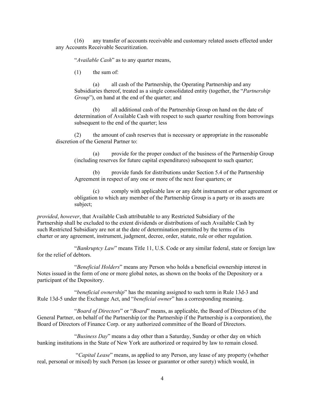 4(16)根据任何应收账款证券化进行的任何应收账款和惯常相关资产的转让。就任何季度而言,“可用现金”是指,(1)以下各项之和:(a)合伙企业、经营合伙企业及其任何子公司的全部现金,作为单一合并实体(统称“合伙企业集团”)处理,季度末在手;(b)在确定该季度的可用现金之日,合伙集团在该季度的所有额外现金因季度末之后的借款而产生;减(2)现金储备金额在普通合伙人的合理酌处权下有必要或适当的:(a)规定在该季度之后适当开展合伙集团的业务(包括未来资本支出的准备金);(b)提供资金,用于根据合伙协议第5.4节就未来四个季度中的任何一个或多个季度进行分配;或(c)遵守适用法律或合伙集团的任何成员为一方或其资产所受的任何债务工具或其他协议或义务;但前提是,该合伙企业的任何受限制附属公司应占的可用现金应被排除在外,但该受限制附属公司的股息或该等可用现金的分配在其章程或任何协议、文书、判决、法令、命令、法规、规则或其他法规的条款允许的确定日期未获批准。“破产法”是指Title 11、美国法典或任何类似的联邦、州或外国法律对债务人的救济。“实益持有人”是指持有以一种或多种全球票据形式发行的票据的实益所有权权益的任何人,如存管人或存管人的参与者的账簿所示。“实益拥有权”具有《交易法》第13d-3条和第13d-5条赋予该术语的含义,“实益拥有人”具有相应的含义。“董事会”或“董事会”(如适用)是指普通合伙人的董事会,代表合伙企业(如果合伙企业是公司,则为合伙企业)、财务公司董事会或董事会的任何授权委员会。“营业日”是指除周六、周日或法律授权或要求纽约州的银行机构保持关闭的其他日子之外的一天。“资本租赁”是指,适用于任何人,由该人(作为承租人或担保人或其他担保人)租赁任何财产(无论是真实的、个人的或混合的),该租赁将在