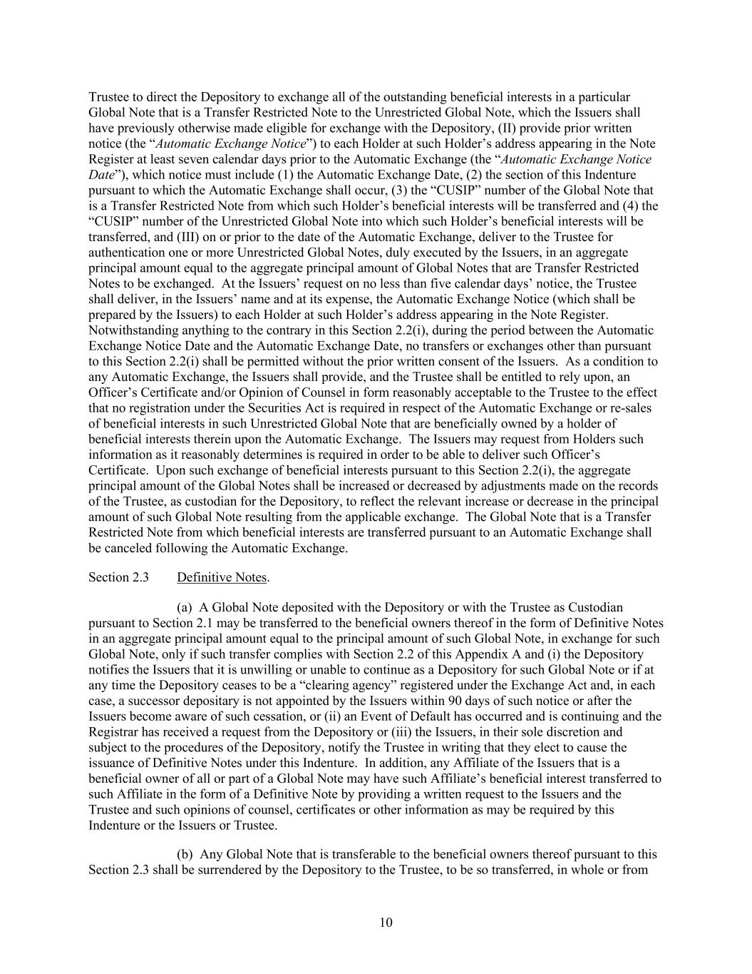 10受托人指示存管人将特定全球票据中属于转让受限制票据的所有未偿实益权益交换为非限制性全球票据,发行人此前应已以其他方式使其有资格与存管人交换,(II)在自动交换(“自动交换通知日期”)至少七个日历日前在票据登记册中出现的该持有人地址向每个持有人提供事先书面通知(“自动交换通知”),该通知必须包括(1)自动交换日期,(2)本契约中发生自动交换的部分,(3)属于转让受限制票据的全球票据的“CUSIP”号码,该持有人的实益权益将从中转让,及(4)该持有人的实益权益将转入的非受限制全球票据的“CUSIP”号码,及(III)于自动交换日期或之前,向受托人交付一份或多于一份由发行人妥为签立的非受限制全球票据以供认证,本金总额等于全球票据的本金总额,这些票据是转让受限制票据以供交换。应发行人的要求并在不少于五个历日的通知下,受托人应以发行人的名义并由其承担费用,将自动交换通知(由发行人编制)以票据登记册中出现的该持有人的地址交付给每个持有人。尽管本条第2.2(i)条另有相反规定,在自动交易所通知日期与自动交易所日期之间的期间内,未经发行人事先书面同意,不得准许依据本条第2.2(i)条以外的任何转让或交易所。作为任何自动交易所的一项条件,发行人应以受托人合理接受的形式提供高级职员证书和/或律师意见,其大意是无需根据《证券法》就自动交易所进行登记或转售此类无限制全球票据的实益权益,而这些实益权益由其中的实益权益持有人在自动交易所实益拥有。发行人可要求持有人提供其合理确定为能够交付该人员证书所需的信息。在根据本条第2.2(i)款进行此种实益权益交换时,全球票据的本金总额应通过对作为存管人的托管人的受托人的记录所作的调整而增加或减少,以反映因适用的交换而导致的此种全球票据本金的相关增加或减少。根据自动交易所转让实益权益的全球票据为转让限制性票据,应在自动交易所之后予以注销。第2.3节确定说明。(a)根据第2.1节存放于存管人或作为托管人存放于受托人的全球票据,可以确定票据的形式转让给其实益拥有人,其本金总额等于该全球票据的本金总额,以换取该全球票据,只有当此种转让符合本附录A第2.2节的规定,且(i)保存人通知发行人其不愿意或无法继续作为此种全球票据的保存人,或在任何时候该保存人不再是根据《交易法》注册的“清算机构”,并且在每种情况下,发行人未在发出此种通知后90天内或在发行人知悉此种停止后指定继任保存人,或(ii)违约事件已发生且仍在继续,而书记官长已收到保管人的请求,或(iii)发行人全权酌情并在遵守保管人程序的情况下,以书面通知受托人,他们选择根据本契约安排发行确定票据。此外,作为全球票据全部或部分实益拥有人的发行人的任何关联公司可通过向发行人和受托人提供书面请求以及本契约或发行人或受托人可能要求的法律顾问意见、证书或其他信息,将该关联公司的实益权益以确定票据的形式转让给该关联公司。(b)任何可依据本条第2.3条转让予其实益拥有人的全球票据,须由保存人将其全部或自