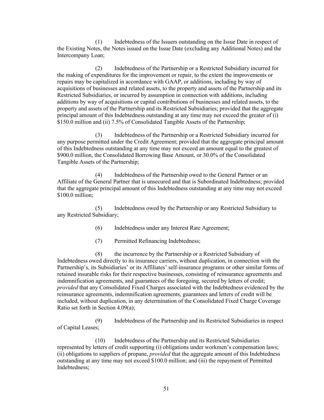 51(1)发行人在发行日就现有票据、在发行日发行的票据(不包括任何附加票据)和公司间贷款而未偿还的债务;(2)合伙企业或受限制子公司因进行改善或维修的支出而产生的债务,前提是改善或维修可能按照公认会计原则资本化,或对合伙企业及其受限制子公司的财产和资产增加,包括通过收购业务和相关资产的方式,或通过承担与增加有关的债务,包括以收购或出资方式增加业务及相关资产,对合伙企业及其受限制子公司的财产和资产;条件是在任何时候未偿还的这笔债务的本金总额不得超过(i)1.50亿美元和(ii)合伙企业合并有形资产的7.5%中的较高者;(3)合伙企业或受限制的子公司为信贷协议允许的任何目的而承担的债务;条件是在任何时候未偿还的这笔债务的本金总额不得超过相等于最大的9.00亿美元,即合并借款基础金额,或合伙企业合并有形资产的30.0%;(4)合伙企业欠普通合伙人或普通合伙人的关联公司的无担保债务,该债务为次级债务;但该债务在任何时候未偿还的本金总额不得超过1亿美元;(5)合伙企业或任何受限制的子公司欠任何受限制的子公司的债务;(6)任何利率协议下的债务;(7)允许的再融资债务;(8)合伙企业或受限制的子公司发生直接欠其保险公司的债务,不重复,与合伙企业、其子公司或其关联企业的自保计划或其各自业务的其他类似形式的保留可保风险有关,包括再保险协议和赔偿协议,以及上述担保,由信用证担保;前提是再保险协议、赔偿协议、担保和信用证所证明的与债务相关的任何合并固定费用将包括在内,不得重复,在确定第4.09(a)节规定的合并固定费用覆盖率时;(9)合伙企业及其受限制子公司在资本租赁方面的债务;(10)以信用证为代表的合伙企业及其受限制子公司的债务,以支持(i)工人赔偿法规定的义务;(ii)对丙烷供应商的义务,但在任何时候未偿债务总额不得超过1亿美元;以及(iii)偿还允许的债务;
