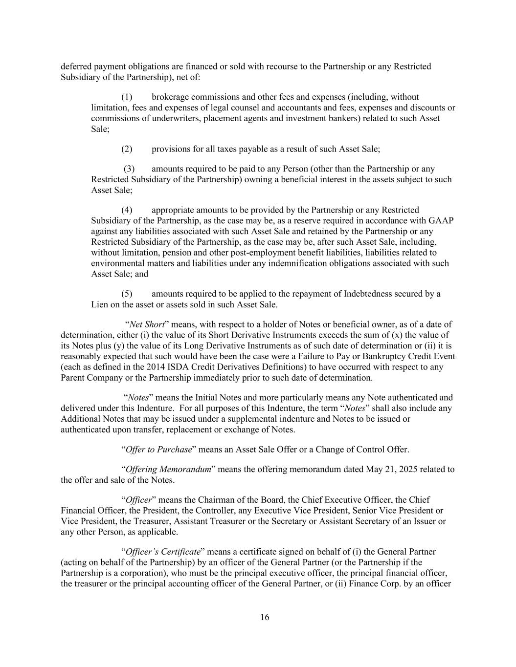 16项延期付款义务通过向合伙企业或合伙企业的任何受限制子公司提供融资或出售),扣除:(1)经纪佣金和其他费用和开支(包括但不限于法律顾问和会计师的费用和开支以及承销商的费用、开支和折扣或佣金,配售代理及投资银行家)与该资产出售有关;(2)就该资产出售而须缴付的所有税款作出规定;(3)须向在该资产出售标的资产中拥有实益权益的任何人(合伙企业或合伙企业的任何受限制附属公司除外)支付的金额;(4)由合伙企业或合伙企业的任何受限制附属公司(视情况而定)提供的适当金额,作为根据公认会计原则要求的准备金,用于支付与此类资产出售相关并由合伙企业或合伙企业的任何受限制子公司(视情况而定)在此类资产出售后保留的任何负债,包括但不限于养老金和其他离职后福利负债、与环境事项相关的负债以及与此类资产出售相关的任何赔偿义务项下的负债;(5)要求用于偿还由此类资产出售中出售的资产或资产的留置权所担保的债务的金额。“净空头”是指,就票据持有人或受益所有人而言,截至确定之日,(i)其空头衍生工具的价值超过(x)其票据价值加上(y)其多头衍生工具在该确定日期的价值之和,或(ii)有理由预计,如果在紧接该确定日期之前发生的任何母公司或合伙企业发生了未付款或破产信用事件(每一项定义均在2014年ISDA信用衍生工具定义中定义),则会出现这种情况。“票据”是指初始票据,更具体地说,是指根据本契约认证和交付的任何票据。就本契约的所有目的而言,“票据”一词还应包括根据补充契约可能发行的任何附加票据以及在票据转让、替换或交换时将发行或认证的票据。“要约收购”是指资产出售要约或控制权变更要约。「发售备忘录」指日期为2025年5月21日的发售备忘录,内容有关票据的发售及发售。“高级职员”指董事会主席、首席执行官、首席财务官、总裁、财务总监、任何执行副总裁、高级副总裁或副总裁、司库、助理司库或发行人的秘书或助理秘书或任何其他人士(如适用)。“高级职员证书”是指由普通合伙人(如果合伙企业是公司,则为合伙企业)的高级职员代表(i)普通合伙人(代表合伙企业行事)签署的证书,该高级职员必须是首席执行官、首席财务官、司库或普通合伙人的首席会计官,或(ii)财务公司由高级职员签署的证书。