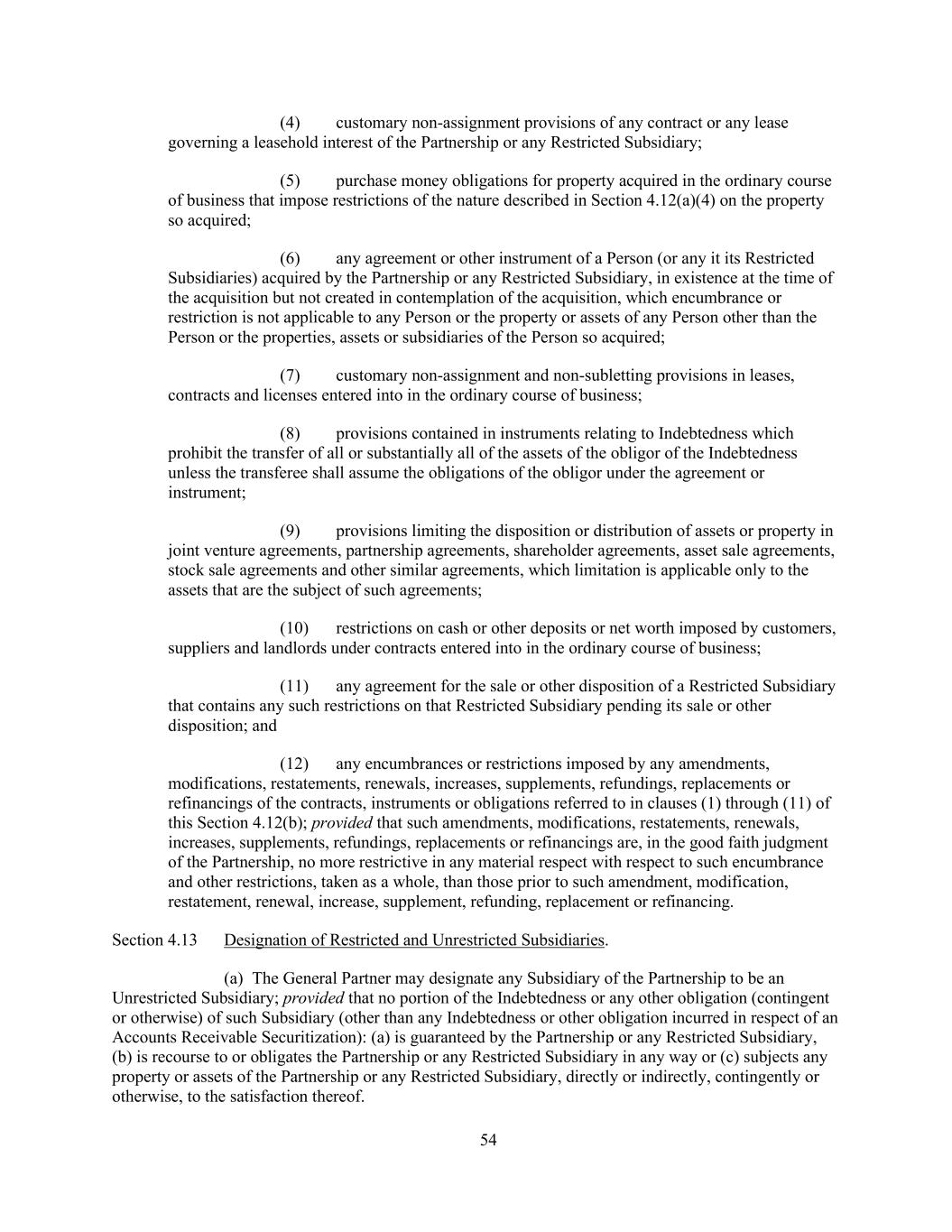54(4)管辖合伙企业或任何受限制子公司的租赁权益的任何合同或任何租赁的惯常非转让条款;(5)在正常经营过程中取得的财产的购置款义务,对如此取得的财产施加第4.12(a)(4)节所述性质的限制;(6)由合伙企业或任何受限制子公司获得的个人(或其任何受限制子公司)的任何协议或其他文书,在收购时存在但未在考虑收购时创建,该产权负担或限制不适用于任何人或除该人以外的任何人的财产或资产或如此取得的人的财产、资产或附属公司;(7)租赁中的惯常不转让和不转租条款,在正常经营过程中订立的合同和许可;(8)与债务有关的文书所载规定,禁止转让债务承付人的全部或实质上全部资产,除非受让人承担该协议或文书项下债务人的义务;(9)在合资协议、合伙协议、股东协议、资产出售协议、股票出售协议和其他类似协议中限制资产或财产处分或分配的规定,该限制仅适用于作为该等协议标的的资产;(10)客户、供应商和房东根据在正常业务过程中订立的合同对现金或其他存款或净值施加的限制;(11)任何关于受限制子公司的出售或其他处置的协议,其中包含对该受限制子公司的任何此类限制,以待其出售或其他处置;(12)合同的任何修订、修改、重述、续期、增加、增加、补充、退款、替换或再融资所施加的任何产权负担或限制,本第4.12(b)条第(1)至(11)款中提及的文书或义务;前提是,根据合伙企业的善意判断,此类修订、修改、重述、续期、增加、补充、退款、替换或再融资在整体上与此类产权负担和其他限制相关的任何重大方面的限制性不高于此类修订、修改、重述、更新、增加、补充、退款、替换或再融资之前的限制性。第4.13节指定受限制和不受限制的子公司。(a)普通合伙人可指定合伙企业的任何子公司为非限制性子公司;但该子公司的任何部分债务或任何其他义务(或有或其他)(就应收账款证券化产生的任何债务或其他义务除外):(a)由合伙企业或任何受限制的子公司担保,(b)以任何方式向合伙企业或任何受限制的子公司追索或承担义务,或(c)直接或间接、或有或其他方式使合伙企业或任何受限制的子公司的任何财产或资产受其清偿。