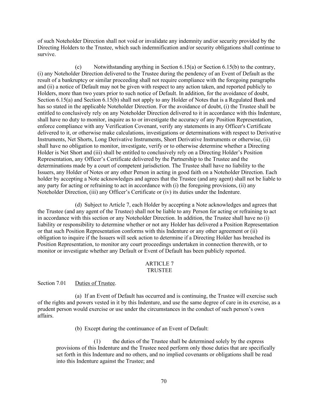此类票据持有人指示的70不应使指示持有人向受托人提供的任何赔偿和/或担保无效或无效,此类赔偿和/或担保义务应继续存在。(c)尽管第6.15(a)条或第6.15(b)条另有相反规定,(i)在破产或类似程序导致的违约事件待决期间交付予受托人的任何票据持有人指示,不得要求遵守前述各段,及(ii)不得就所采取的任何行动发出违约通知,并在该违约通知发出前两年以上向持有人公开报告。此外,为免生疑问,第6.15(a)条和第6.15(b)条不适用于作为受监管银行并已在适用的票据持有人指示中如此说明的任何票据持有人。为免生疑问,(i)受托人有权最终依赖根据本指引交付予其的任何记账人指示,并无责任监察、查询或调查任何持仓陈述的准确性,强制执行任何验证契约的遵守,核实交付予其的任何高级人员证书中的任何陈述,或以其他方式就衍生工具、净空头、多头衍生工具、空头衍生工具或其他方面作出计算、调查或决定,(ii)无义务监察、调查,核实或以其他方式确定指示持有人是否存在净空头,并且(iii)有权最终依赖指示持有人的职位代表、合伙企业交付给受托人的任何高级职员证书以及有管辖权的法院作出的决定。受托人对发行人、任何票据持有人或任何其他根据票据持有人指示善意行事的人概不负法律责任。每名持有人通过接受票据承认并同意,受托人(及任何代理人)无须就任何一方根据(i)上述条文、(ii)任何票据持有人指示、(iii)任何高级人员证书或(iv)其在义齿下的职责行事或不作为而对任何一方承担法律责任。(d)除第7条另有规定外,每名持有人透过接受票据,承认并同意受托人(及受托人的任何代理人)无须就根据本条或任何票据持有人指示行事或不作为而对任何人承担法律责任。此外,受托人没有(i)责任或责任来确定任何持有人是否已交付头寸代表或此类头寸代表是否符合本契约或任何其他协议,或(ii)有义务询问发行人是否会寻求行动以确定指示持有人是否已违反其头寸代表,监测与此相关的任何法院诉讼程序,或监测或调查是否已公开报告任何违约或违约事件。第七条受托人第7.01款受托人的职责。(a)如违约事件已经发生并仍在继续,则受托人将行使本契约赋予其的权利和权力,并在行使时使用与审慎的人在处理该人自己的事务时在情况下行使或使用的同等程度的谨慎。(b)除在违约事件持续期间外:(1)受托人的职责仅由本契约的明文规定确定,受托人只需履行本契约中具体规定的职责,而无需履行其他职责,不得将任何默示的契诺或义务解读为本契约中针对受托人的内容;和