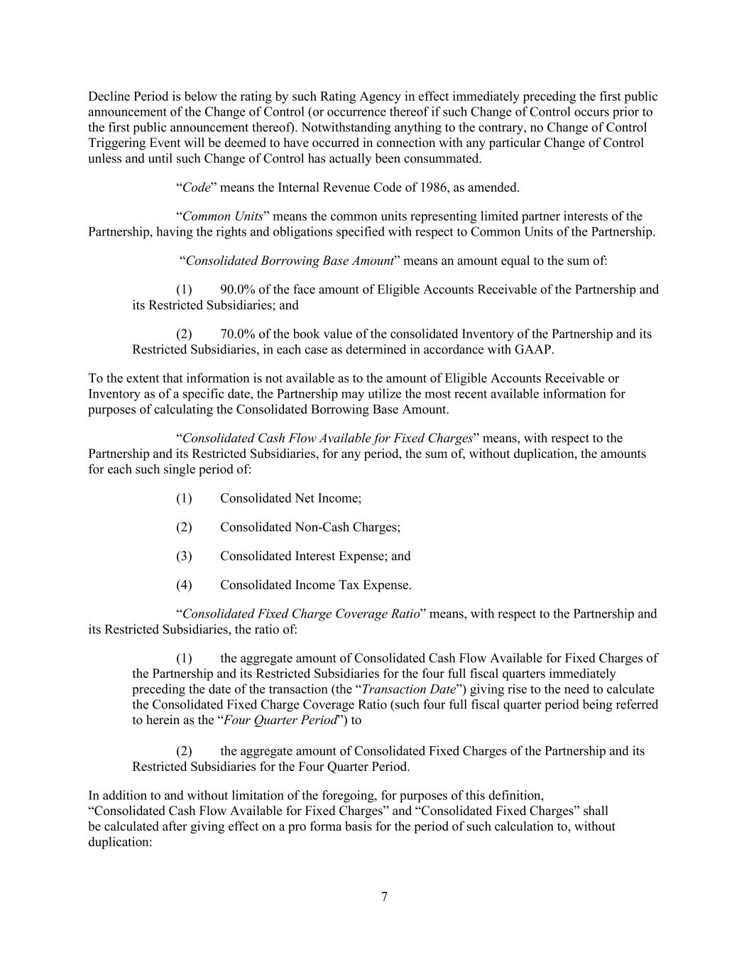 7衰退期低于该评级机构在紧接控制权变更的首次公开公告(或如该控制权变更发生在其首次公开公告之前)之前有效的评级。尽管有任何相反的情况,除非及直至该等控制权变更已实际完成,否则任何控制权变更触发事件均不会被视为与任何特定控制权变更有关。“法典”是指经修订的1986年《国内税收法典》。“共同单位”是指代表合伙企业有限合伙人利益的共同单位,具有就合伙企业共同单位规定的权利和义务。“合并借款基础金额”是指以下各项之和的金额:(1)合伙企业及其受限制子公司的合格应收账款面值的90.0%;(2)合伙企业及其受限制子公司的合并存货账面价值的70.0%,在每种情况下均按照公认会计原则确定。在无法获得截至特定日期合格应收账款或存货金额信息的情况下,合伙企业可利用最近可获得的信息来计算综合借款基础金额。“可用于固定费用的合并现金流”是指,就合伙企业及其受限制的子公司而言,在任何期间,每个此类单一期间的金额之和(不重复)为:(1)合并净收益;(2)合并非现金费用;(3)合并利息费用;(4)合并所得税费用。“合并定额收费覆盖率”是指,对于合伙企业及其受限子公司,(1)导致需要计算合并固定费用覆盖率的合伙企业及其受限子公司在紧接交易日期(“交易日期”)之前的四个完整财政季度(此种四个完整财政季度期间在本文中称为“四季期”)可用于固定费用的合并现金流总额与(2)该合伙企业及其受限子公司在第四季度期间的合并固定费用总额的比率。除上述规定外,就本定义而言,“可用于固定费用的合并现金流量”和“合并固定费用”应在计算期间按备考基准生效后计算至,不得重复: