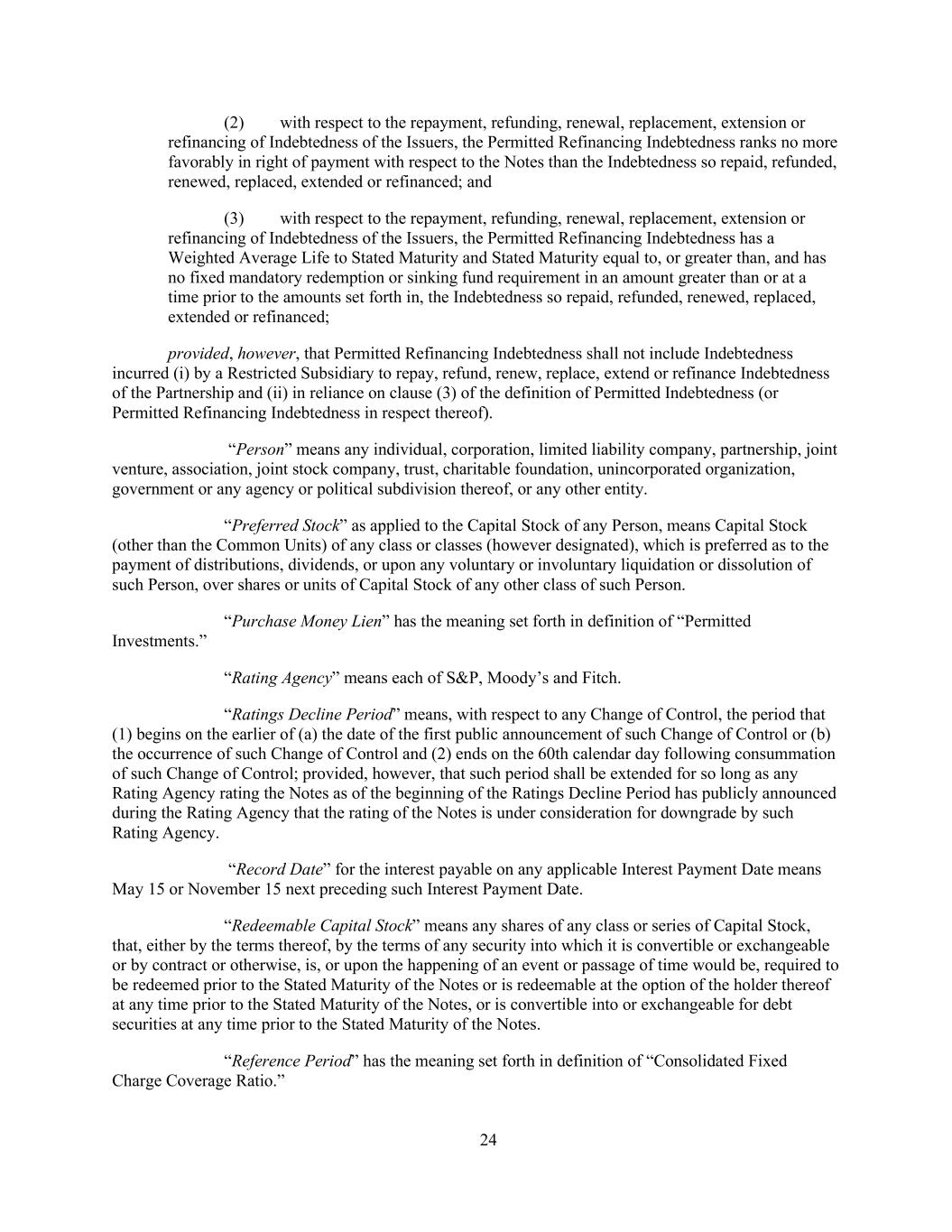 24(2)就发行人的债务偿还、退还、续期、置换、展期或再融资而言,许可的再融资债务就票据而言在受偿权上的排名不比如此偿还、退还、续期、置换、展期或再融资的债务更有利;(3)就发行人的债务偿还、退还、续期、置换、展期或再融资而言,许可的再融资债务的加权平均期限至规定到期日和规定到期日等于或大于,并且没有固定的强制赎回或偿债基金要求,其金额大于或在如此偿还、退还、续期、置换、展期或再融资的债务中所述的金额之前的某个时间;但前提是,允许的再融资债务不应包括(i)受限制的子公司为偿还、退还、续期、置换、延长或再融资合伙企业的债务而发生的债务,以及(ii)依赖于允许的债务定义的第(3)条(或与此相关的允许的再融资债务)。“人”是指任何个人、公司、有限责任公司、合伙企业、合营企业、协会、股份公司、信托、慈善基金会、非法人组织、政府或其任何机构或政治分支机构,或任何其他实体。适用于任何人的股本的“优先股”是指任何类别或类别(无论是否指定)的股本(普通单位除外),在支付分配、股息或在该人的任何自愿或非自愿清算或解散时,优先于该人的任何其他类别的股份或股本单位。“购买资金留置权”具有“许可投资”定义中规定的含义。“评级机构”是指标普、穆迪和惠誉各一家。“评级下降期”是指,就任何控制权变更而言,(1)开始于(a)该控制权变更的首次公开公告之日或(b)该控制权变更的发生和(2)结束于该控制权变更完成后的第60个日历日(以较早者为准)的期间;但前提是,只要在评级下降期开始时对票据进行评级的任何评级机构已在评级机构期间公开宣布该评级机构正在考虑下调票据评级,则该期限应予延长。任何适用的利息支付日的应付利息的“记录日期”指该利息支付日之前的下一个5月15日或11月15日。“可赎回股本”是指任何类别或系列股本的任何股份,根据其条款、根据其可转换或可交换成的任何证券的条款或通过合同或其他方式,或在发生事件或时间流逝时,将被要求在票据规定的到期日之前赎回,或可由其持有人选择在票据规定的到期日之前的任何时间赎回,或可在票据的规定到期日之前的任何时间转换为或交换为债务证券。“参考期”具有“合并固定费用覆盖率”定义中阐述的含义。