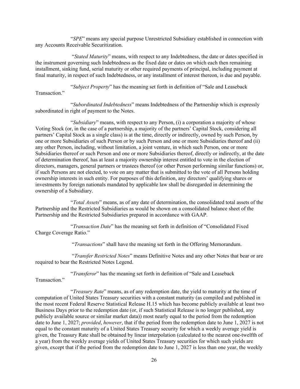 26“SPE”是指与任何应收账款证券化相关而设立的任何特殊目的非限制性子公司。“规定到期日”是指,就任何债务而言,在管辖该债务的文书中指定的一个或多个日期,如就该债务到期和应付的每一期然后剩余的分期付款、偿债基金、连续到期日或其他所需的本金付款(包括最终到期时的付款)或其任何分期利息的一个或多个固定日期。“标的物”具有“售后回租交易”定义中规定的含义。“次级债务”是指合伙企业在受偿权上明确从属于票据的债务。“子公司”是指,就任何人而言,(i)一家公司,其有表决权的股份(或,在合伙企业的情况下,将所有合伙人的股本视为一个单一类别)当时由该人、该人的一个或多个子公司或该人及其一个或多个子公司直接或间接拥有,以及(ii)任何其他人,包括但不限于该人、其一个或多个子公司或该人及其一个或多个子公司在其中的合资企业,直接或间接地,在确定之日,至少拥有多数所有权权益,有权在董事、经理、普通合伙人或其受托人(或履行类似职能的其他人)的选举中投票,或者,如果这些人未当选,则有权对提交给在该实体中持有所有权权益的所有人投票的任何事项进行投票。为本定义的目的,在确定子公司的所有权时,应忽略适用法律规定的外国国民的任何董事合格股份或投资。“总资产”是指,截至任何确定日期,根据公认会计原则编制的合伙企业和受限制子公司的合并资产总额将显示在合伙企业和受限制子公司的合并资产负债表上。“交易日期”具有“合并固定费用覆盖率”定义中阐述的含义。“交易”应具有发售备忘录中规定的含义。“转让受限制票据”是指最终票据和任何其他承担或被要求承担受限制票据图例的票据。“转让人”具有“售后回租交易”定义中规定的含义。“国库券利率”是指,截至任何赎回日,在计算恒定期限的美国国库券时的到期收益率(在最近的美联储统计发布H.15中汇编和发布,该版本在赎回日之前至少两个工作日(或者,如果该统计发布不再发布,则为任何公开来源或类似市场数据))最接近于赎回日至2027年6月1日期间的收益率;但前提是,如果从赎回日至6月1日期间,2027年不等于给出周平均收益率的美国国债证券的固定期限,国债利率应从给出此类收益率的美国国债证券的周平均收益率中通过线性插值(计算到最接近的一年的十二分之一)得到,但如果从赎回日到2027年6月1日的期限不到一年,则周