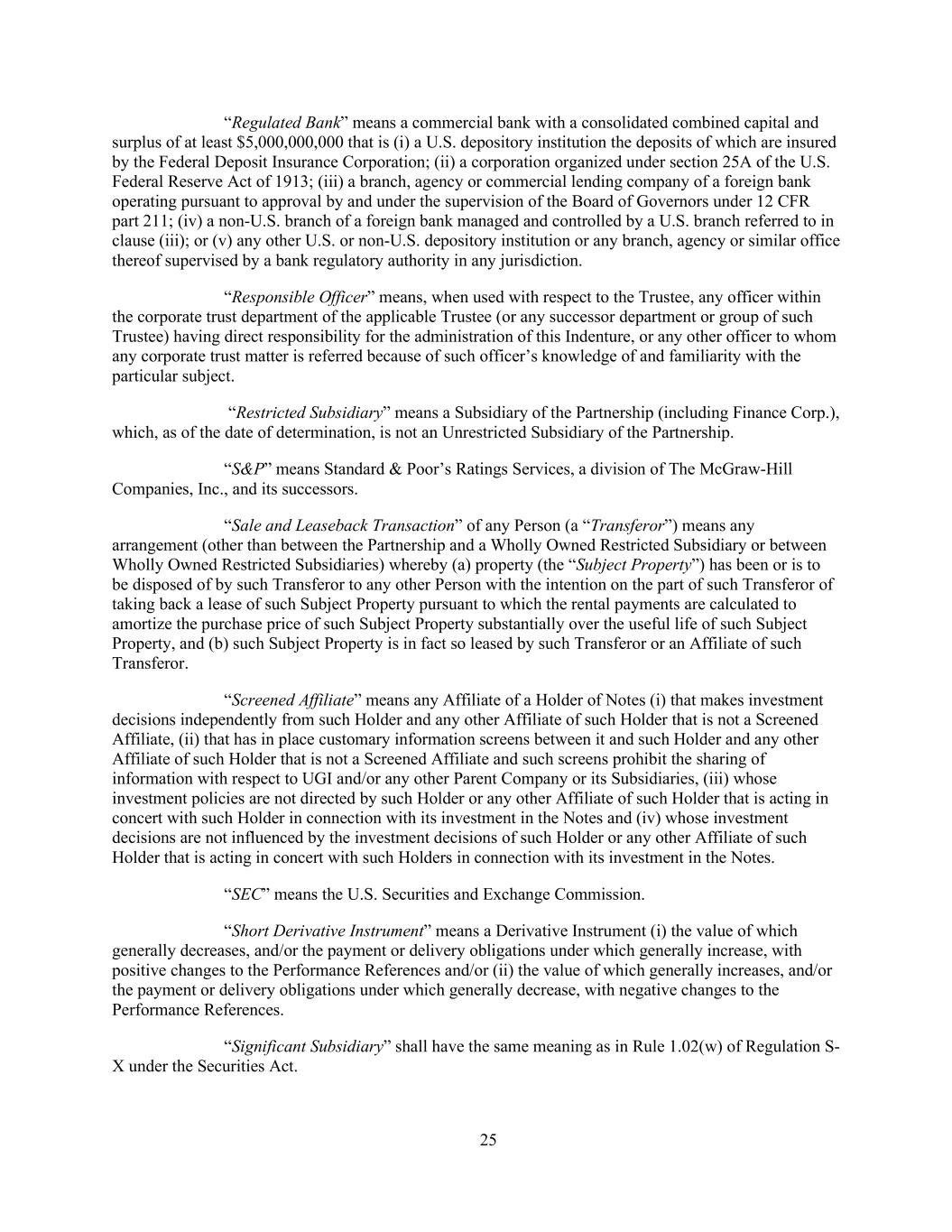 25“受监管银行”指合并资本和盈余至少为5,000,000,000美元的商业银行,即(i)美国存款机构,其存款由联邦存款保险公司投保;(ii)根据1913年美国联邦储备法第25A条组建的公司;(iii)分支机构,外国银行的代理或商业贷款公司根据12 CFR第211部分根据理事会的批准经营并在其监督下经营;(iv)由第(iii)款所述美国分行管理和控制的外国银行的非美国分行;或(v)任何其他美国或非美国存款机构或其在任何司法管辖区受银行监管机构监管的任何分支机构、机构或类似办事处。“负责人员”(Responsible Officer)是指,就受托人而言,适用的受托人的公司信托部门(或该受托人的任何继任部门或集团)内对本契约的管理负有直接责任的任何高级人员,或任何公司信托事项因该高级人员对特定主题的了解和熟悉而被转介给的任何其他高级人员。“受限制附属公司”指合伙企业的附属公司(包括Finance Corp.),截至确定之日,该附属公司并非合伙企业的非受限制附属公司。“标普”是指麦格劳-希尔公司(McGraw-Hill Companies,Inc.)旗下的一个部门标准普尔评级服务公司及其继任者。任何人(“转让人”)的“售后回租交易”指任何安排(合伙企业与全资受限制附属公司之间或全资受限制附属公司之间除外),据此(a)财产(“标的财产”)已经或将由该转让人处置给任何其他人,而该转让人有意收回该标的财产的租赁,据此计算租金付款以在该标的财产的使用寿命内大幅摊销该标的财产的购买价款,(b)该等标的财产事实上是由该等转让人或该等转让人的附属公司如此租赁的。“经筛选的关联公司”是指票据持有人的任何关联公司,该持有人(i)独立于该持有人作出投资决策,且该持有人的任何其他非经筛选的关联公司,(ii)在其与该持有人以及该持有人的任何其他非经筛选的关联公司之间设置了惯常的信息屏幕,且该等屏幕禁止共享有关UGI和/或任何其他母公司或其子公司的信息,(iii)其投资政策并非由该持有人或就其对票据的投资而与该持有人一致行动的该持有人的任何其他联属公司所指示,及(iv)其投资决定不受该持有人或就其对票据的投资而与该持有人一致行动的该持有人的任何其他联属公司的投资决定所影响。“SEC”是指美国证券交易委员会。“空头衍生工具”是指(i)其价值一般下降的衍生工具,和/或根据其承担的付款或交付义务一般增加,业绩参考发生积极变化和/或(ii)其价值一般增加,和/或根据其承担的付款或交付义务一般减少,业绩参考发生消极变化的衍生工具。“重要子公司”与《证券法》S-X条例第1.02(w)条的含义相同。