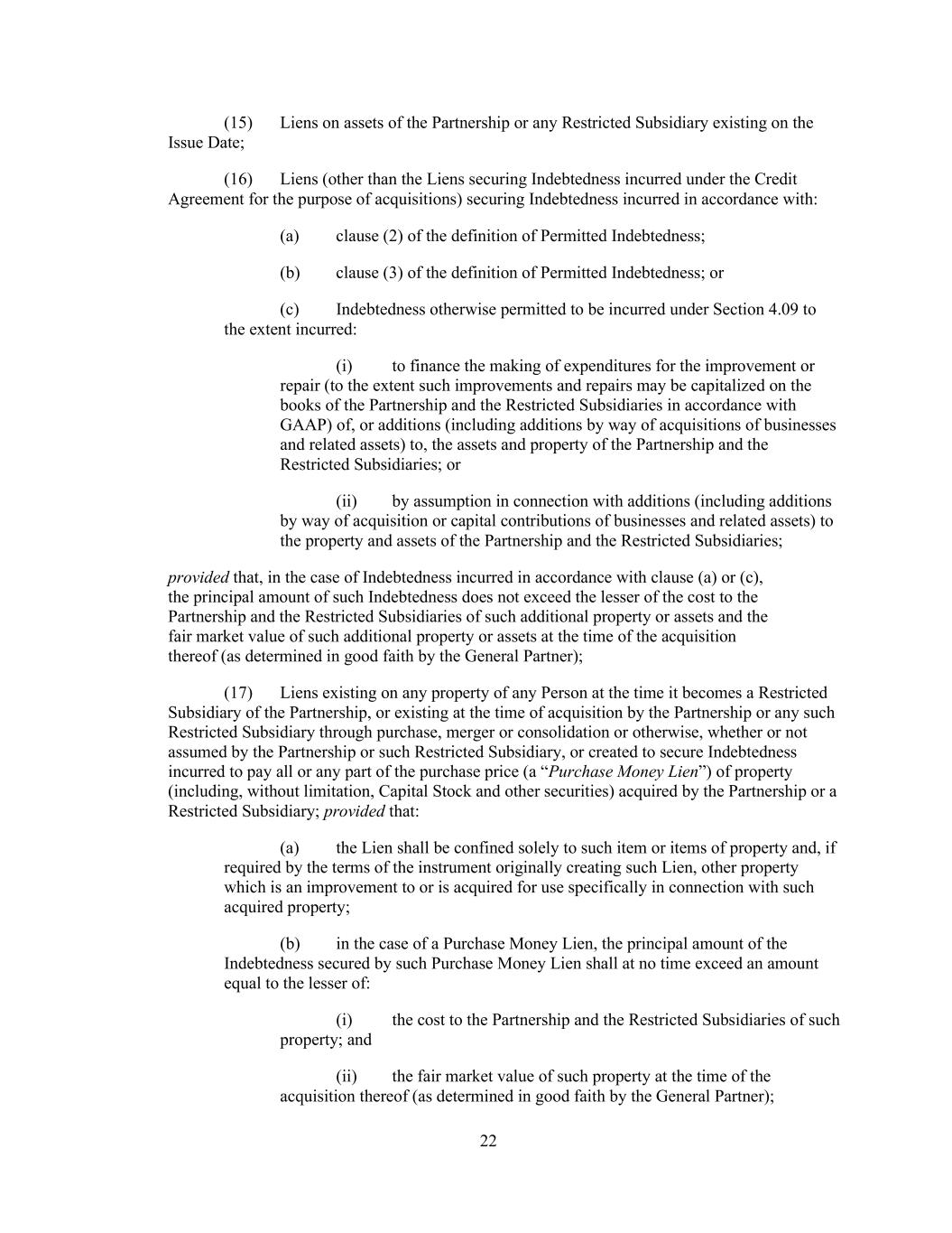 22(15)对在发行日存在的合伙企业或任何受限制子公司的资产的留置权;(16)留置权(根据信贷协议为收购目的而产生的担保债务的留置权除外)为根据以下规定而产生的债务提供担保:(a)许可债务定义第(2)条;(b)许可债务定义第(3)条;或(c)根据第4.09条以其他方式允许产生的债务,在发生的范围内:(i)为改善或修复的支出提供资金(以该等改善为限根据公认会计原则,合伙企业和受限制子公司的资产和财产可以在合伙企业和受限制子公司的账面上资本化或增加(包括通过收购业务和相关资产的方式增加);或(ii)通过与合伙企业和受限制子公司的财产和资产的增加(包括通过收购业务和相关资产的方式增加或出资的方式)有关的假设;但前提是,在根据(a)或(c)条产生的债务的情况下,该等债务的本金额不超过合伙企业及该等额外财产或资产的受限制子公司的成本与该等额外财产或资产在收购时的公允市场价值(由普通合伙人善意确定)中的较低者;(17)在任何人成为合伙企业的受限制子公司时存在于任何人的任何财产上的留置权,或在该合伙企业或任何该等受限制子公司通过购买、合并或合并或其他方式收购时存在的留置权,无论是否由合伙企业或此类受限制子公司承担,或为担保为支付合伙企业或受限制子公司获得的财产(包括但不限于股本和其他证券)的全部或任何部分购买价款(“购买款项留置权”)而产生的债务而设定;但前提是:(a)留置权应仅限于此类物项或物项,如果最初设定该留置权的文书条款要求,其他财产,是对该等所获财产的改良或为特别与该等所获财产有关的用途而取得;(b)在购买款项留置权的情况下,该等购买款项留置权所担保的债务的本金额在任何时候不得超过等于以下两者中较低者的金额:(i)该等财产对合伙企业和受限制子公司的成本;(ii)该等财产在取得时的公平市场价值(由普通合伙人善意确定);