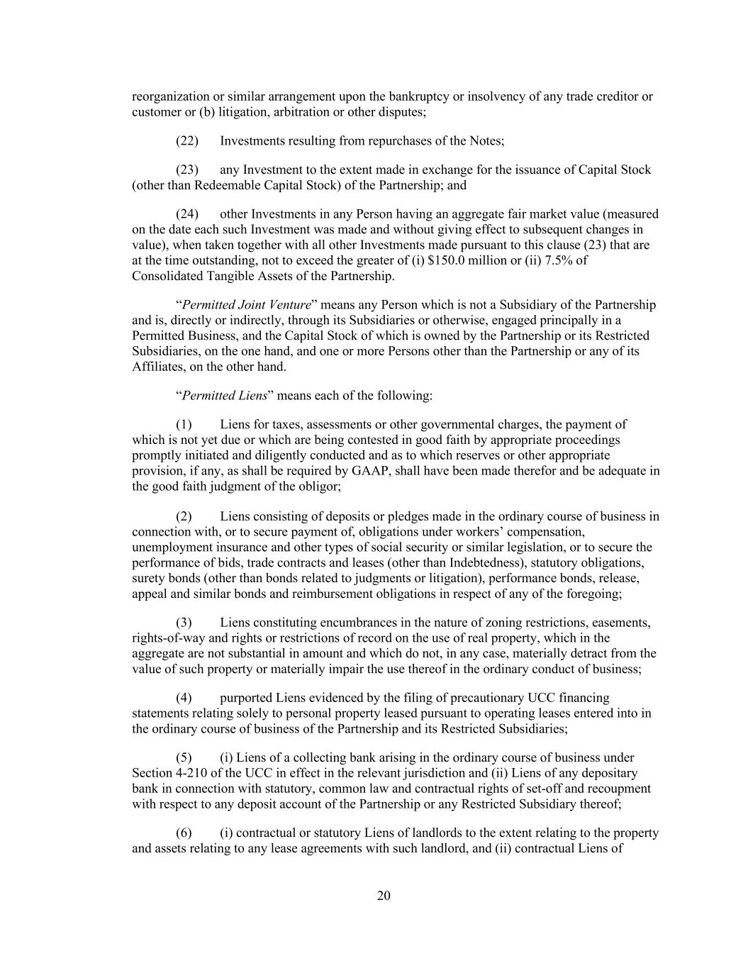 20在任何贸易债权人或客户破产或资不抵债或(b)诉讼、仲裁或其他争议时进行重组或类似安排;(22)因回购票据而产生的投资;(23)以交换合伙企业发行股本(可赎回股本除外)为条件的任何投资;(24)对任何具有合计公平市场价值的人的其他投资(以每项此类投资作出之日计量且不影响随后的价值变动),如果连同根据本条第(23)款进行的所有其他当时未偿还的投资一起计算,则不超过(i)1.50亿美元或(ii)合伙企业合并有形资产的7.5%中的较高者。“获准合营企业”是指任何非合伙企业的附属公司并直接或间接通过其附属公司或以其他方式主要从事许可业务的人士,而其股本一方面由合伙企业或其受限制附属公司拥有,另一方面由合伙企业或其任何附属公司以外的一名或多名人士拥有。“允许的留置权”是指以下各项:(1)税款、摊款或其他政府收费的留置权,这些款项尚未到期支付,或正在被迅速启动和勤勉进行的适当程序善意地质疑,以及就哪些准备金或其他适当的准备金(如有)已按公认会计原则的要求作出,并在债务人的善意判断中是充分的;(2)留置权,包括在正常业务过程中就以下事项作出的存款或质押,或为确保支付,根据工人赔偿、失业保险和其他类型的社会保障或类似立法承担的义务,或为保证投标、贸易合同和租赁(债务除外)、法定义务、担保债券(与判决或诉讼有关的债券除外)、履约债券、解除担保、上诉和类似债券以及与上述任何一项有关的偿付义务而承担的义务;(3)构成分区限制、地役权、通行权和不动产使用权利或记录限制性质的产权负担的留置权,这些留置权合计金额不大,且无论如何不,重大减损该等财产的价值或重大损害该等财产在正常经营业务中的使用;(4)提交仅与根据在合伙企业及其受限制子公司的正常业务过程中订立的经营租赁所租赁的个人财产有关的预防性UCC融资报表所证明的所谓留置权;(5)(i)根据相关司法管辖区有效的《UCC》第4-210条在正常业务过程中产生的收款银行的留置权,以及(ii)任何存托银行在与法定、关于合伙企业或其任何受限制子公司的任何存款账户的普通法和合同抵销和补偿权利;(6)(i)房东的合同或法定留置权,以与该房东的任何租赁协议有关的财产和资产为限,以及(ii)的合同留置权