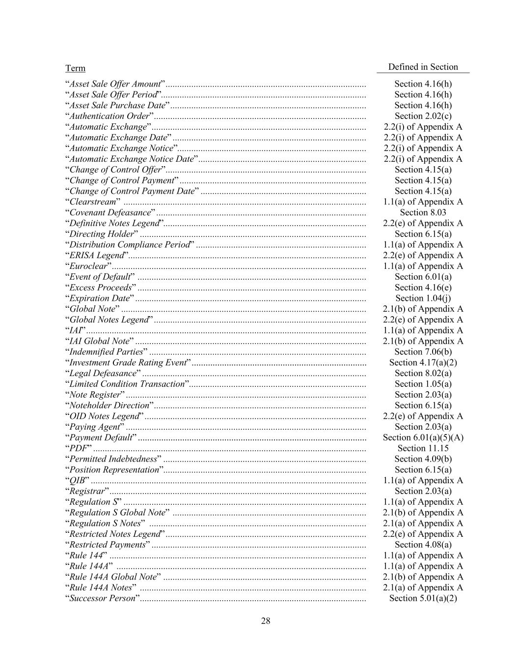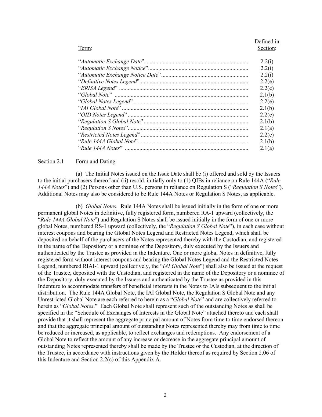 2个术语:定义于:“自动交换日期”的部分.................................................................................... 2.2(i)“自动交换通知”.................................................... 2.2(i)“自动交换通知日期”.................................... 2.2(i)“最终票据传说”.................................................... 2.2(e)“ERISA传说”.................................................................... 2.2(e)“全球票据传说”.................................................................... 2.1(b)“IAI全球票据”.................................................... 2.2(e)“OID Notes传说”.................................................................... 2.1(e)“Regulation S Global Note”.................................................................... 2.1(b)“Regulation S Notes”.................................................................... 2.1(a)“Restricted Notes Legend”并由发行人出售给其初始购买者和(ii)转售,最初仅出售给(1)依据规则144A的QIB(“规则144A票据”)和(2)依据条例S的美国人以外的人(“条例S票据”)。附加票据也可视情况被视为规则144a票据或条例S票据。(b)全球说明。第144A条规则的票据最初应以一种或多种最终、完全注册形式、编号为RA-1向上的永久性全球票据(统称为“第144A条规则的全球票据”)的形式发行,第S条规则的票据最初应以一种或多种全球票据的形式发行,编号为RS-1向上的全球票据(统称为“第S条规则的全球票据”),在每种情况下均不带息票,并附有全球票据图例和限制性票据图例,这些图例应代表由此所代表的票据购买者存放在托管人处,并以保管人或保管人代名人的名义登记,由发行人妥为签立,并按义齿的规定由受托人认证。还应应受托人的要求发行一张或多张最终的、完全登记的无息票形式的、带有全球票据传奇和限制性票据传奇的、向上编号为RIAI-1的全球票据(统称为“IAI全球票据”),存放于托管人,并登记在存管人或存管人的代名人名下,由发行人正式签署,并由受托人按照本契约的规定进行认证,以适应在首次分配之后向国际投资机构转让票据的实益权益。规则144a全球票据、IAI全球票据、条例S全球票据和任何不受限制的全球票据在此分别称为“全球票据”,并在此统称为“全球票据”。每份全球票据须代表其所附的“全球票据权益交换附表”所指明的未偿还票据,且每份票据均须规定,该票据须代表不时在其上背书的票据本金总额,而该票据所代表的未偿还票据本金总额可不时减少或增加(如适用),以反映兑换和赎回。全球票据的任何背书,以反映由此所代表的未偿票据本金总额的任何增加或减少的金额,应由受托人或托管人根据受托人的指示,按照本契约第2.06节和本附录A第2.2(c)节的要求,按照全球票据持有人发出的指示作出。