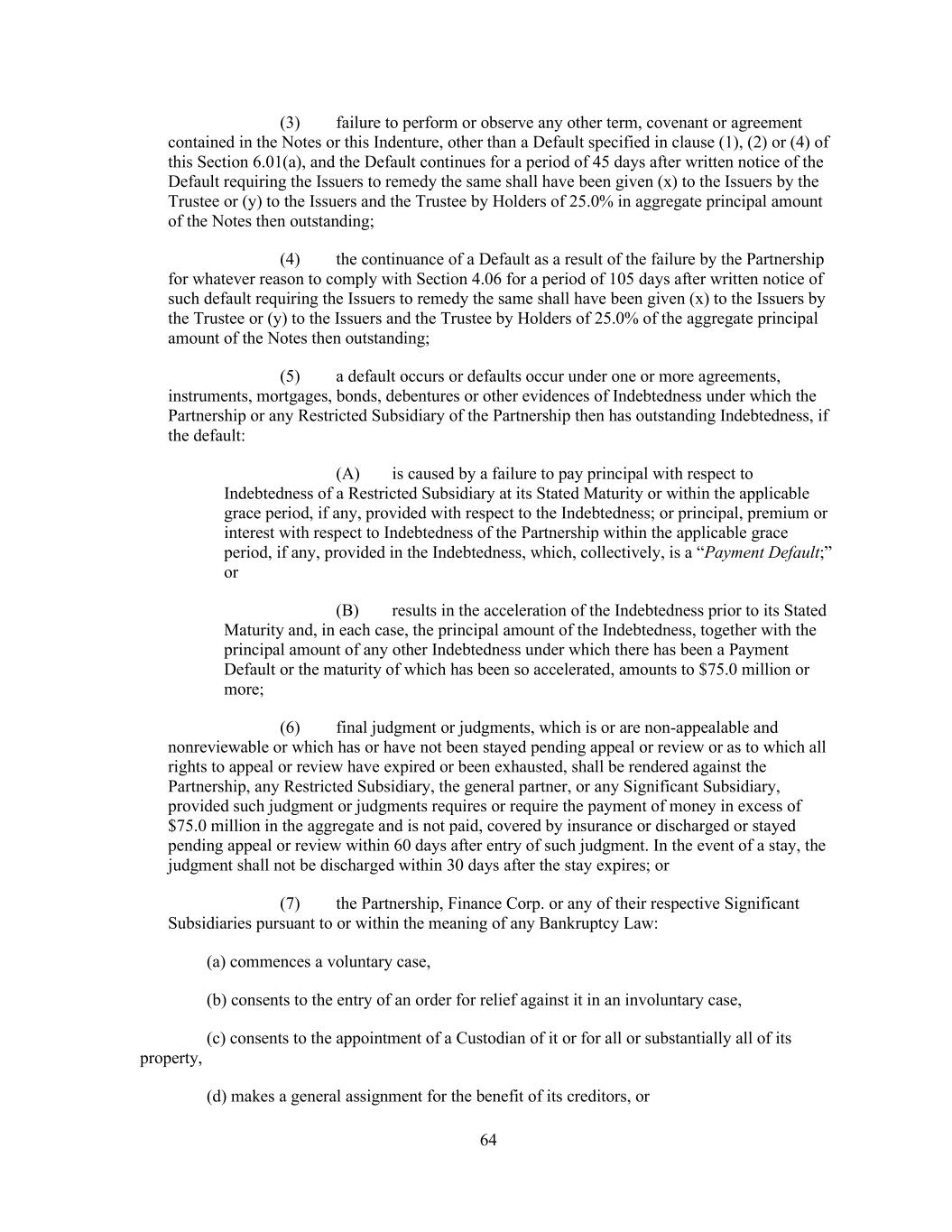64(3)除本条第6.01(a)条第(1)、(2)或(4)款指明的违约外,没有履行或遵守《说明》或本指引所载的任何其他条款、契诺或协议,且要求发行人补救的违约书面通知应已由受托人向发行人发出(x)或(y)向发行人发出后,违约持续45天及由当时未偿还票据本金总额25.0%的持有人向受托人作出的承诺;(4)由于合伙企业无论出于何种原因未能遵守第4.06条而导致的违约在要求发行人采取补救措施的书面违约通知发出后的105天内持续存在,应由受托人向发行人发出(x)或(y)向发行人发出(5)根据一项或多项协议、票据、抵押、债券、债权证或其他债务证据发生违约或违约,而合伙企业或合伙企业的任何受限制附属公司当时根据这些协议、票据、抵押、债券、债权证或其他债务证据存在未偿债务,如果违约:(a)是由于未能在规定的到期日或在就债务规定的任何适用宽限期(如有)内就受限制附属公司的债务支付本金所致;或本金,与债务中规定的适用宽限期(如有)内的合伙企业债务相关的溢价或利息,统称为“付款违约”;或(b)导致债务在其规定的到期之前加速,在每种情况下,债务的本金金额,连同发生付款违约或到期如此加速的任何其他债务的本金金额,达7500万美元或更多;(6)最终判决或判决,应针对合伙企业、任何受限制的附属公司、普通合伙人或任何重要附属公司提出或不可上诉和不可复核,或已经或尚未中止等待上诉或复核,或所有上诉或复核的权利已届满或已用尽,但该等判决或判决要求或要求支付总额超过7500万美元的款项,且未在作出该等判决后60天内支付、保险承保或解除或中止等待上诉或复核。在中止的情况下,不得在中止到期后30天内解除判决;或(7)合伙企业、财务公司或其各自的任何重要子公司根据或在任何破产法的含义内:(a)启动自愿案件,(b)同意在非自愿案件中输入针对其的救济令,(c)同意指定其托管人或为其全部或基本全部财产,(d)为其债权人的利益进行一般转让,或