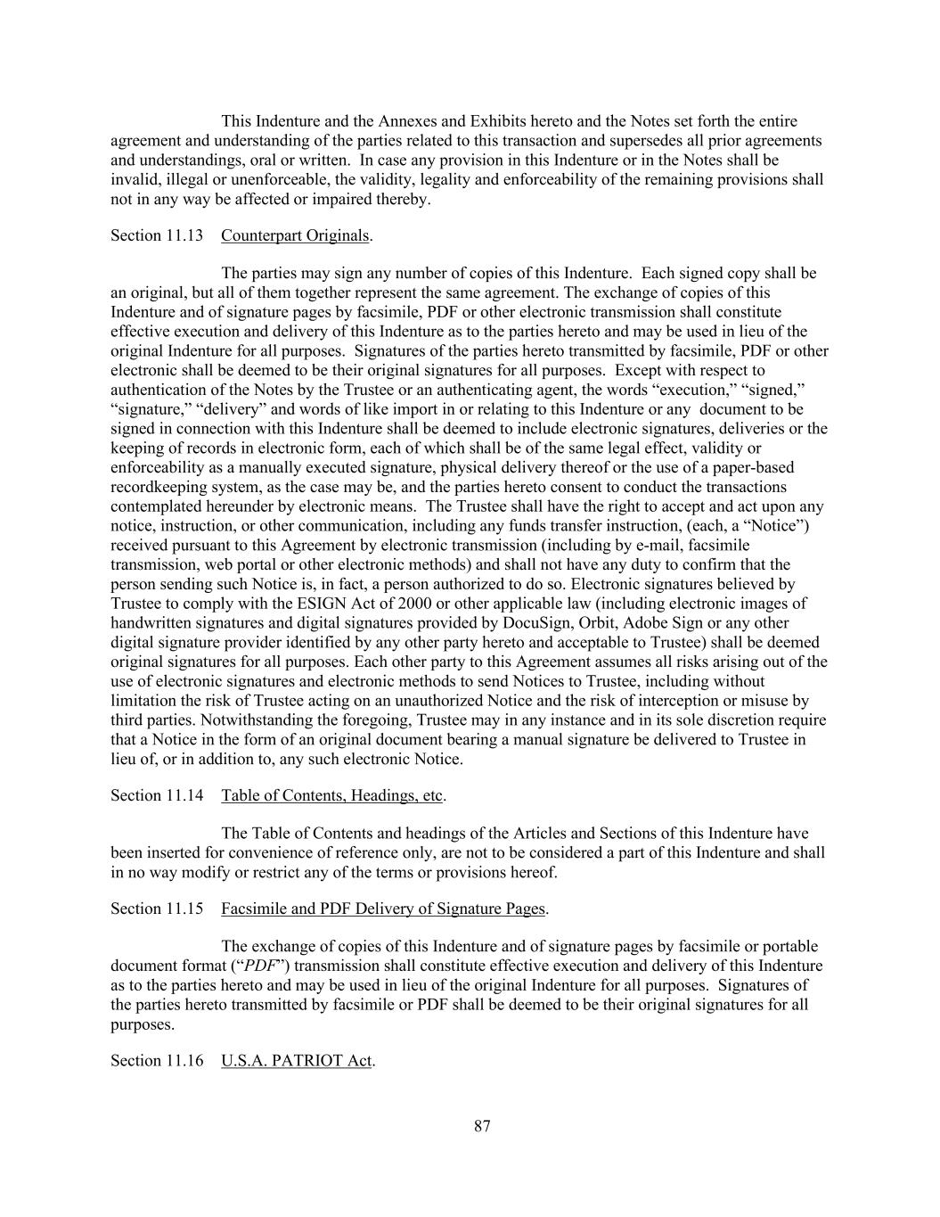 87本契约和本契约的附件和附件以及附注载列了与本次交易有关的各方的全部协议和谅解,并取代了之前的所有口头或书面协议和谅解。如本义齿或票据中的任何条款无效、非法或不可执行,则其余条款的有效性、合法性和可执行性不因此而受到任何影响或损害。第11.13节对应原件。当事人可以签署任意数量的本义齿副本。每一份签名副本应为原件,但全部加在一起代表同一份协议。以传真、PDF或其他电子传输方式交换本契约的副本和签名页,应构成对本契约各方的有效执行和交付,并可用于所有目的以代替原始契约。以传真、PDF或其他电子方式传送的双方签字,在任何情况下均视为其签字原件。除有关受托人或认证代理人认证票据外,有关“执行”、“签署”、“签署”、本契约中或与本契约有关的“交付”和类似进口字样或与本契约有关的任何拟签署文件,应被视为包括电子签字、交付或以电子形式保存记录,每一项均应具有与手工签署的签字、实物交付或使用纸质记录保存系统(视情况而定)相同的法律效力、有效性或可执行性,且双方同意以电子方式进行本协议项下所设想的交易。受托人有权接受根据本协议以电子传输方式(包括电子邮件、传真传输、门户网站或其他电子方式)收到的任何通知、指示或其他通信,包括任何资金转移指示(每一项,“通知”)并就此采取行动,并且没有任何义务确认发送该通知的人实际上是被授权这样做的人。被受托人认为符合2000年ESIGN法案或其他适用法律的电子签名(包括手写签名的电子图像和由DocuSign、Orbit、Adobe Sign或任何其他由本协议任何其他方确定并为受托人所接受的任何其他数字签名提供者提供的数字签名)应被视为所有目的的原始签名。本协议的另一方承担因使用电子签名和电子方式向受托人发送通知而产生的所有风险,包括但不限于受托人根据未经授权的通知行事的风险以及被第三方拦截或滥用的风险。尽管有上述规定,受托人仍可在任何情况下并在其唯一酌情决定权下要求将带有人工签名的原始文件形式的通知交付给受托人,以代替或补充任何此类电子通知。第11.14节目录、标题等已插入本义齿各条款和章节的目录和标题仅供参考,不应被视为本义齿的一部分,并且绝不应修改或限制本义齿的任何条款或规定。第11.15节签名页的传真和PDF交付。以传真或便携式文件格式(“PDF”)传输的方式交换本义齿的副本和签名页,应构成本义齿对合同各方的有效执行和交付,并可用于所有目的以代替原始义齿。以传真或PDF格式传送的双方签字,在任何情况下均视为其签字原件。第11.16节美国爱国者法。