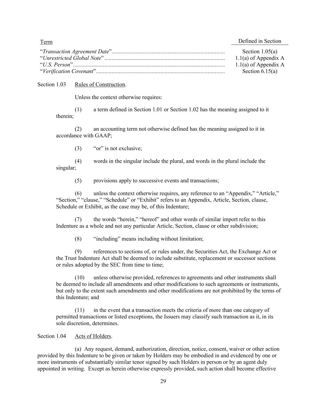 “交易协议日期”一节中定义的29个期限...................................................................................。附录A“美国人”第1.05(a)节“不受限制的全球票据”....................................................................附录A“核查公约”第1.1(a)节...................................................................................。第6.15(a)节第1.03节施工规则。除非上下文另有要求:(1)第1.01节或第1.02节中定义的术语具有其中赋予的含义;(2)未另有定义的会计术语具有根据公认会计原则赋予它的含义;(3)“或”不是排他性的;(4)单数中的词包括复数,复数中的词包括单数;(5)规定适用于连续的事件和交易;(6)除非上下文另有要求,任何提及“附录”、“条款”、“第“附表”或“附件”是指本义齿的附录、条款、条文、附表或附件(视情况而定);(7)“此处”字样,“hereof”和其他类似含义的词语是指本义齿作为一个整体,而不是指任何特定的条款、节、款或其他细分项;(8)“包括”是指包括但不限于;(9)对《证券法》、《交易法》或《信托义齿法》的章节或规则的提及,应被视为包括SEC不时通过的替代、替代或继承的章节或规则;(10)除非另有规定,对协议和其他文书的提及应被视为包括对此类协议或文书的所有修订和其他修改,但仅限于此类修订和其他修改不受本契约条款禁止的范围内;(11)在交易符合不止一类允许交易或所列例外的标准的情况下,发行人可自行决定对该交易进行分类。第1.04节持有人的行为。(a)由持有人提出或采取的任何由本契约规定的要求、要求、授权、指示、通知、同意、放弃或其他行动,可由该等持有人亲自或由妥为书面委任的代理人签署的一份或多于一份实质上相似的期限的文书体现和证明。除本文另有明文规定外,该行为应生效