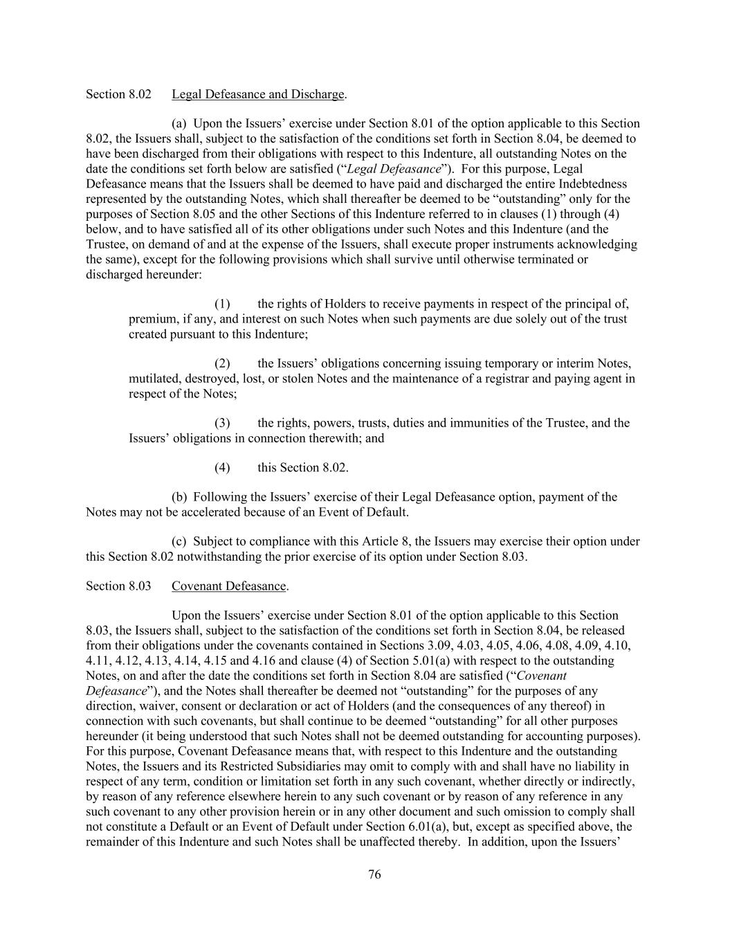 76第8.02节法定撤销和解除。(a)在发行人根据适用于本第8.02条的选择权第8.01条行使时,发行人在满足第8.04条规定的条件的前提下,应被视为已解除其与本义齿有关的义务,在满足下述条件之日的所有未偿票据(“法律失效”)。为此目的,法定撤销是指发行人应被视为已支付并解除未偿还票据所代表的全部债务,此后仅就第8.05条和下文第(1)至(4)条提及的本义齿的其他章节而言,该债务应被视为“未偿还”,并已履行其在该等票据和本义齿下的所有其他义务(并且受托人应发行人的要求并由发行人承担费用,应签署适当的确认该债务的文书),但下列规定在本协议另有规定终止或解除前仍有效的除外:(1)持有人在该等票据的本金、溢价(如有的话)和利息方面收取付款的权利,当该等付款完全来自依据本契约设立的信托时;(2)发行人就发行临时或临时票据、残缺、毁损、遗失或被盗票据以及就票据维持登记员和付款代理人的义务;(3)受托人的权利、权力、信托、义务和豁免,及发行人与此有关的义务;及(4)本第8.02条。(b)在发行人行使其法定撤销选择权后,票据的支付可能不会因为违约事件而加速。(c)在遵守本条第8款的前提下,尽管事先根据第8.03条行使了选择权,但发行人仍可根据本条第8.02条行使其选择权。第8.03条公约撤销。在发行人根据适用于本第8.03条的选择权第8.01条行使时,发行人须在满足第8.04条规定的条件的情况下,于第8.04条规定的条件得到满足之日及之后解除其根据第3.09、4.03、4.05、4.06、4.08、4.09、4.10、4.11、4.12、4.13、4.14、4.15和4.16条及第5.01(a)条第(4)款所载的与未偿还票据有关的契诺所承担的义务(“契诺失效”),此后就任何指示而言,票据应被视为不“未偿还”,持有人就该等契诺作出的放弃、同意或声明或作为(以及其中任何一项的后果),但就本协议项下的所有其他目的而言,应继续被视为“未偿付”(但有一项理解,即此类票据在会计目的上不应被视为未偿付)。为此目的,契约失效是指,就本契约及未偿还票据而言,发行人及其受限制附属公司可能会忽略遵守任何该等契约所载的任何条款、条件或限制,亦无须就该等条款、条件或限制承担任何责任,不论是直接或间接,因任何该等契诺在本文其他地方的任何提述,或因任何该等契诺在本文或任何其他文件中的任何提述,而该等不遵守不构成第6.01(a)条所指的违约或违约事件,但除上文指明外,本契约的其余部分及该等票据不受影响。此外,根据发行人的