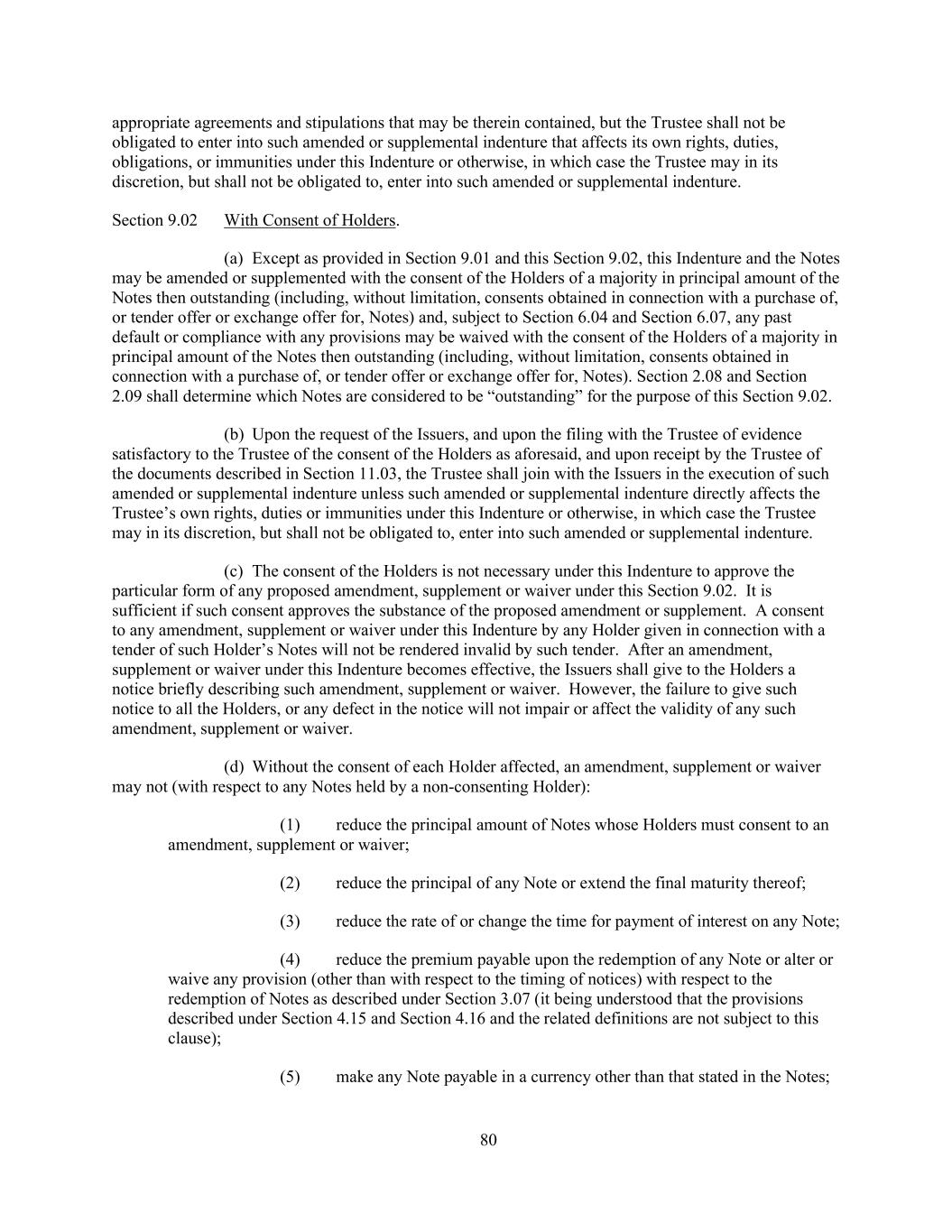 其中可能包含的80项适当协议和规定,但受托人没有义务订立影响其自身在本契约或其他契约下的权利、义务、义务或豁免的经修订或补充契约,在这种情况下,受托人可以酌情但没有义务订立经修订或补充契约。第9.02条经持有人同意。(a)除第9.01条及本第9.02条另有规定外,本契约及票据可经当时尚未偿付的票据本金过半数的持有人同意(包括但不限于就购买票据、要约收购或交换要约而取得的同意)而作出修订或补充,而在符合第6.04条及第6.07条的规定下,任何过往的失责或遵守任何条文,均可经当时尚未偿付的票据本金过半数的持有人同意(包括但不限于,票据的购买、要约收购或交换要约所取得的同意)。第2.08条和第2.09条应确定就本第9.02条而言,哪些票据被视为“未偿还”。(b)应发行人的要求,并在向受托人提交受托人信纳上述持有人同意的证据后,以及在受托人收到第11.03条所述的文件后,受托人应与发行人一起执行该等经修订或补充契约,除非该等经修订或补充契约直接影响受托人本身在本契约或其他方面的权利、义务或豁免,在此情况下,受托人可酌情订立但无义务订立该等经修订或补充契约。(c)根据本指引,无须取得持有人的同意,以批准根据本条第9.02条提出的任何修订、补充或放弃的特定形式。如果这种同意批准了拟议修正或补充的实质内容,就足够了。任何持有人就该持有人的票据的投标而给予的对本契约下的任何修订、补充或放弃的同意,不会因该投标而失效。本契约项下的修正、补充或放弃生效后,发行人应向持有人发出简述该修正、补充或放弃的通知。然而,未能向所有持有人发出该等通知,或该通知中的任何瑕疵,均不会损害或影响任何该等修订、补充或放弃的有效性。(d)未经每名受影响的持有人同意,修订、补充或放弃不得(就非同意持有人所持有的任何票据而言):(1)减少其持有人必须同意修订的票据的本金,补充或豁免;(2)减少任何票据的本金或延长其最后期限;(3)降低任何票据的利率或更改任何票据的利息支付时间;(4)减少赎回任何票据时应付的溢价或更改或豁免根据第3.07条所述有关赎回票据的任何条文(通知时间方面除外)(理解为根据第4.15节和第4.16节所述的规定以及相关定义不受本条款的约束);(5)使任何票据以票据中所述货币以外的货币支付;