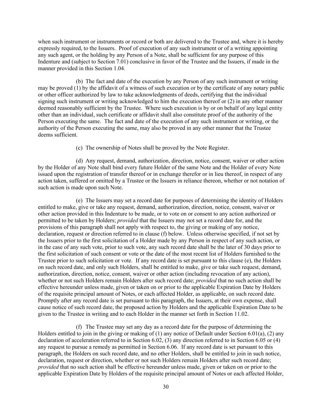 30当此类文书或文书或记录或两者均交付给受托人,并在此明确要求的情况下交付给发行人。任何该等文书的签立证明或委任任何该等代理人的书面证明,或任何人持有票据的证明,如按本条第1.04条规定的方式作出,即足以用于本指引的任何目的,并(在符合第7.01条的规定下)具有有利于受托人和发行人的结论性证明。(b)任何人签立任何该等文书或书面的事实及日期,可由(1)该等签立的证人的誓章或任何公证人或获法律授权采取契据确认的其他人员的证明书证明,证明签署该等文书或书面的个人向他承认该等文书或书面的签立,或(2)以受托人认为合理足够的任何其他方式证明。由个人以外的任何法人或由其代表执行的,该证明或誓章也应构成执行该证明或誓章的人的权威证明。任何该等文书或书面的签立事实及日期,或签立该等文书或书面的人的权限,亦可以受托人认为足够的任何其他方式证明。(c)票据的所有权须由票据登记册证明。(d)任何票据持有人提出的任何要求、要求、授权、指示、通知、同意、放弃或其他行动,须对同一票据的每名未来持有人及在该票据的转让登记时或作为交换或代替而发行的每份票据的持有人,就受托人或发行人所依赖的任何已采取、遭受或遗漏的任何行动具有约束力,不论该等行动是否在该票据上作出注明。(e)发行人可设定记录日期,以确定有权作出、给予或采取本契约中规定的任何请求、要求、授权、指示、通知、同意、放弃或其他行动的持有人的身份,或对持有人授权或允许采取的任何行动进行投票或同意;但发行人不得就以下(f)条提及的任何通知、声明、请求或指示的给予或作出设定记录日期,且本款规定不适用于该记录日期。除非另有说明,如发行人未在任何人就任何该等行动作出的首次持有人征集之前设定,或如属任何该等投票,则在该投票之前,任何该等记录日期应为首次征集该等同意或投票前30天或在该等征集或投票前向受托人提供的最近的持有人名单日期,以较后者为准。如任何记录日期是根据本(e)条设定的,则该记录日期的持有人,且只有该等持有人,有权提出、给予或采取该等请求、要求、授权、指示、通知、同意、放弃或其他行动(包括撤销任何行动),无论该等持有人在该记录日期后是否仍为持有人;但除非在该记录日期由所需本金金额的票据持有人或每个受影响的持有人(如适用)在适用的到期日或之前作出、给予或采取,否则该等行动不得根据本协议生效。在依据本款设定任何记录日期后,发行人应自费安排将该记录日期、持有人建议的行动及适用的到期日的通知以书面形式送达受托人及按第11.02条所述方式送达各持有人。(f)受托人可将任何一天定为纪录日期,以决定有权参与根据第6.01(a)条发出或作出(1)任何违约通知的持有人,(2)第6.02条所提述的任何加速声明,(3)第6.05条所提述的任何指示或(4)第6.06条所准许的寻求补救的任何请求。如依据本款设定任何记录日期,则该记录日期的持有人而非任何其他持有人均无权加入该通知、声明、要求或指示,不论该等持有人在该记录日期后是否仍为持有人;但除非票据所需本金持有人或每一受影响的持有人在适用的到期日或之前作出、给予或采取该等行动,否则该等行动不得根据本协议生效,