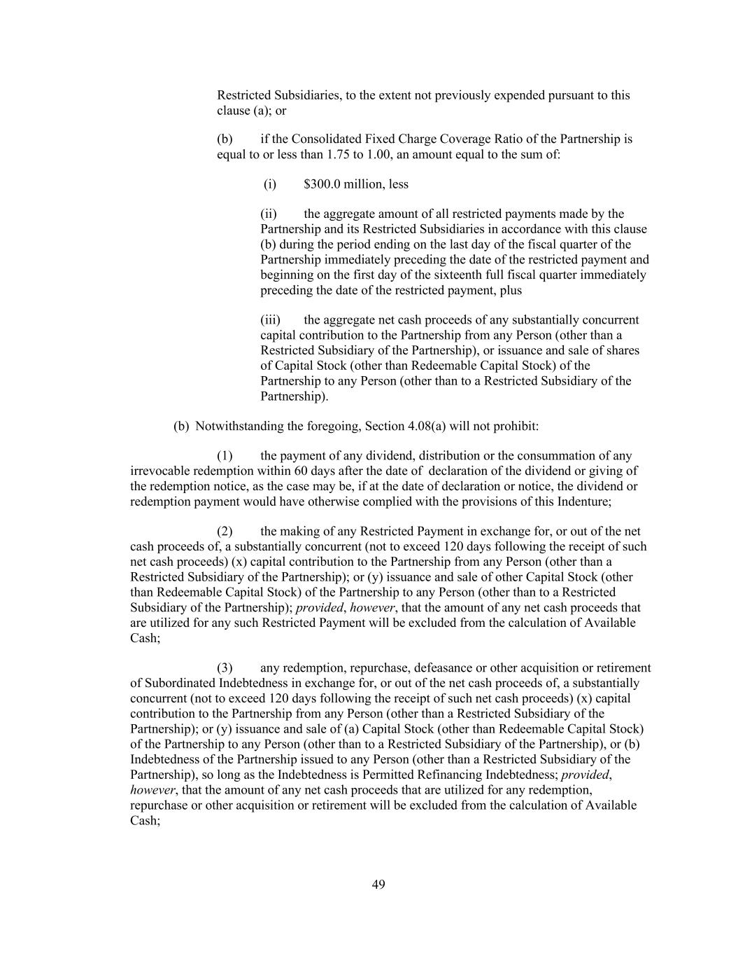 49家受限制子公司,但以以前未根据本条款(a)项支出为限;或(b)如果合伙企业的合并固定费用覆盖率等于或低于1.75至1.00,金额等于:(i)3亿美元之和,减去(ii)合伙企业及其受限制子公司在紧接受限制付款日期之前的合伙企业财政季度的最后一天结束并在紧接受限制付款日期之前的第十六个完整财政季度的第一天开始的期间内根据本条款(b)支付的所有受限制付款的总额,加上(iii)任何人(合伙企业的受限制子公司除外)向合伙企业提供的任何实质上同时出资的现金所得款项总额,或向任何人(合伙企业的受限制附属公司除外)发行及出售合伙企业的股本股份(可赎回股本除外)。(b)尽管有上述规定,第4.08(a)条并不禁止:(1)在宣布股息或发出赎回通知(视属何情况而定)的日期后60天内支付任何股息、分派或完成任何不可撤销赎回,倘在宣布或通知的日期,股息或赎回付款本应符合本指引的规定;(2)作出任何受限制的付款以换取或从现金所得款项净额中,基本上同时进行(不超过收到该等现金净收益后120天)(x)任何人士(合伙的受限制附属公司除外)对合伙的出资;或(y)向任何人士(合伙的受限制附属公司除外)发行及出售合伙的其他股本(可赎回股本除外);但条件是,用于任何该等受限制付款的任何现金净收益的金额将不包括在可动用现金的计算中;(3)任何赎回、回购、撤销或以其他方式收购或报废次级债务,以换取或从基本上同时发生(不超过收到该等现金净收益后120天)(x)任何人(合伙企业的受限制附属公司除外)向合伙企业的出资;或(y)向任何人(合伙企业的受限制附属公司除外)发行和出售(a)合伙企业的股本(可赎回股本除外),或(b)合伙企业向任何人(合伙企业的受限制附属公司除外)发行的债务,只要债务被允许再融资债务;但前提是用于任何赎回、回购或其他收购或报废的任何净现金收益的金额将被排除在可用现金的计算之外;