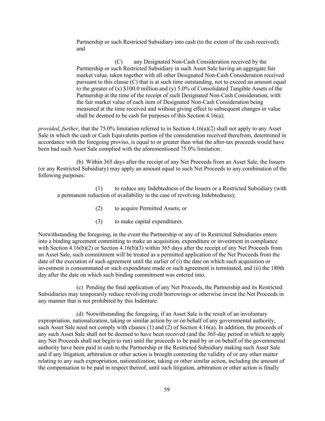 59合伙企业或此类受限制子公司转为现金(以收到的现金为限);(c)合伙企业或此类受限制子公司在此类资产出售中收到的具有合计公允市场价值的任何指定非现金对价,连同根据本条款(c)收到的所有其他在该时间未偿还的指定非现金对价,金额不得超过在收到该指定非现金对价时,合伙企业合并有形资产的(x)1.00亿美元和(y)5.0%中较高者,鉴于每一项指定非现金代价的公允市场价值在收到时正在计量且不影响随后的价值变动,就本条第4.16(a)款而言,应被视为现金;但进一步规定,第4.16(a)(2)节中提及的75.0%限制不适用于根据前述但书确定的现金或现金等价物部分所收到的代价的任何资产出售,等于或大于如果该资产出售符合前述75.0%的限制本应获得的税后收益。(b)在收到资产出售的任何净收益后的365天内,发行人(或任何受限制的附属公司)可将与该净收益相等的金额用于以下目的的任意组合:(1)减少发行人或受限制的附属公司的任何债务(在循环债务的情况下永久减少可用性);(2)收购许可资产;或(3)进行资本支出。尽管有上述规定,如果合伙企业或其任何受限制的子公司订立具有约束力的协议,承诺在收到资产出售的任何净收益后365天内按照第4.16(b)(2)节或第4.16(b)(3)节进行收购、支出或投资,则该承诺将被视为自该协议执行之日起至(i)完成该收购或投资或作出该支出或该协议终止之日(以较早者为准)的净收益的允许应用,及(ii)订立该等具约束力的承诺日期后第180天。(c)在任何净收益的最终应用之前,合伙企业及其受限制的子公司可以暂时减少循环信用借款或以本契约不禁止的任何方式将净收益进行投资。(d)尽管有上述规定,如果资产出售是任何政府当局或代表任何政府当局的非自愿征用、国有化、采取或类似行动的结果,则此种资产出售不必遵守第4.16(a)条第(1)和(2)款。此外,任何该等资产出售的所得款项,在由政府当局或代表政府当局将支付的所得款项以现金支付予合伙企业或进行该等资产出售的受限制附属公司之前,如提出任何诉讼、仲裁或其他诉讼,质疑任何该等征收、国有化、采取或其他类似行动的有效性或与任何该等征收、国有化、采取或其他类似行动有关的任何其他事项,则不得视为已收到(且适用任何净收益的365天期限不得开始运行),包括就其应支付的赔偿金额,直至该等诉讼、仲裁或其他诉讼最终