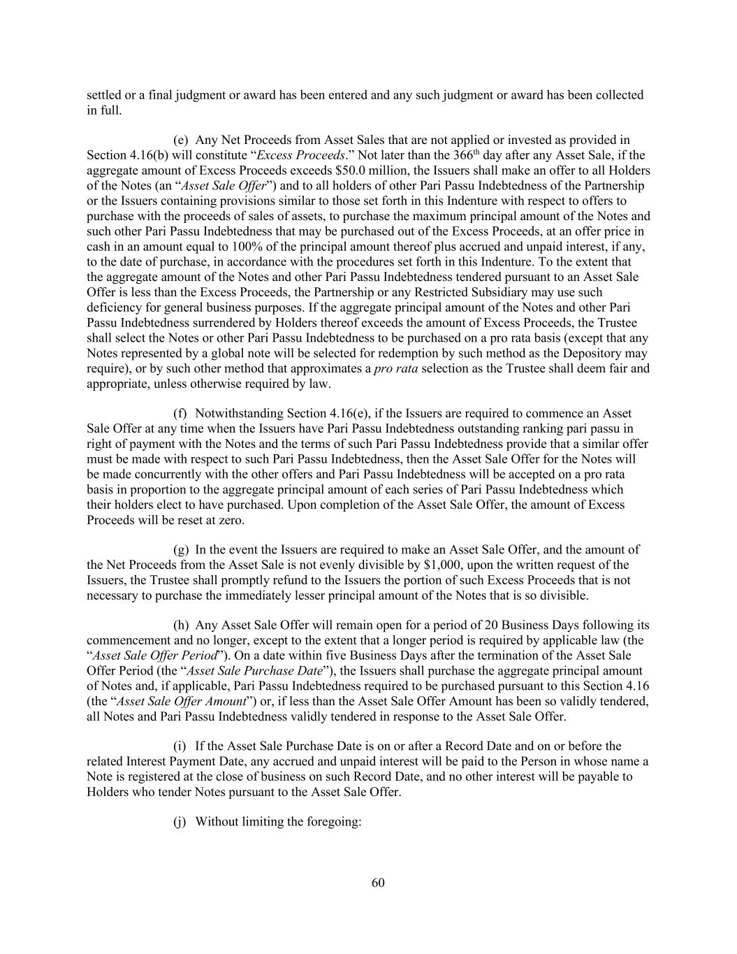 60个已结算或已作出最终判决或裁决,任何该等判决或裁决已全额收取。(e)未按第4.16(b)节的规定应用或投资的任何资产出售净收益将构成“超额收益”。不迟于任何资产出售后的第366天,如果超额收益总额超过5000万美元,发行人应向票据的所有持有人(“资产出售要约”)和向合伙企业或发行人的所有其他Pari Passu债务持有人提出要约,其中包含与本契约中关于以出售资产的收益购买要约的规定类似的条款,以购买票据的最高本金金额以及可能从超额收益中购买的此类其他Pari Passu债务,按照本契约规定的程序,以现金发售价,金额相当于其本金的100%加上截至购买之日的应计和未付利息(如有)。如果根据资产出售要约投标的票据和其他Pari Passu债务的总额低于超额收益,合伙企业或任何受限制的子公司可将此项缺陷用于一般商业目的。如持有人交出的票据及其他Pari Passu债务的本金总额超过超额收益的金额,则受托人应按比例选择拟购买的票据或其他Pari Passu债务(但全球票据所代表的任何票据将按存管人可能要求的方法选择赎回),或按受托人认为公平和适当的近似按比例选择的其他方法选择,除非法律另有规定。(f)尽管有第4.16(e)条的规定,如发行人须在任何时间开始资产出售要约,而发行人有未偿还的Pari Passu债务与票据享有同等受偿权,且该Pari Passu债务的条款规定,必须就该Pari Passu债务提出类似要约,然后,票据的资产出售要约将与其他要约同时提出,Pari Passu债务将按其持有人选择已购买的每一系列Pari Passu债务的本金总额的比例按比例接受。资产出售要约完成后,超额收益金额将重置为零。(g)如果发行人被要求提出资产出售要约,而资产出售的净收益金额不能平均除以1000美元,则应根据发行人的书面请求,受托人应立即向发行人退还此类超额收益中没有必要购买如此可分割的票据的直接较少本金金额的部分。(h)任何资产出售要约将在其开始后的20个工作日内保持开放,并且不再开放,除非适用法律要求更长的期限(“资产出售要约期”)。在资产出售要约期(“资产出售购买日”)终止后五个营业日内的某个日期,发行人应购买票据本金总额以及(如适用)根据本第4.16条要求购买的Pari Passu债务(“资产出售要约金额”),或者,如果低于已如此有效投标的资产出售要约金额,则应根据资产出售要约有效投标的所有票据和Pari Passu债务。(i)倘资产出售购买日期为记录日期或之后及相关利息支付日期或之前,任何应计及未付利息将于该记录日期的营业时间结束时支付予以其名义登记票据的人,而根据资产出售要约投标票据的持有人将不会获支付任何其他利息。(j)在不限制前述内容的情况下: