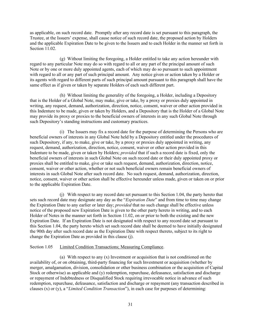 31(如适用),在该记录日期。在根据本款设定任何记录日期后,受托人应促使以第11.02条规定的方式向发行人和每位持有人发出有关该记录日期、持有人提议的行动和适用的到期日的通知,费用由发行人承担。(g)在不限制前述规定的情况下,有权根据本协议就任何特定票据采取任何行动的持有人,可就该票据的全部或任何部分本金或由一名或多于一名妥为委任的代理人这样做,每一名代理人均可依据该委任就该本金的全部或任何部分这样做。持有人或其代理人依据本款就该本金金额的不同部分发出的任何通知或采取的任何行动,具有与由每一该等不同部分的单独持有人发出或采取的相同效力。(h)在不限制前述一般性的情况下,持有人,包括作为全球票据持有人的存管人,可由一名或多名以书面正式指定的代理人作出、给予或采取本义齿中规定由持有人作出、给予或采取的任何请求、要求、授权、指示、通知、同意、放弃或其他行动,而作为全球票据持有人的存管人可通过该存管人的长期指示和惯例向任何该等全球票据权益的受益所有人提供其代理人或代理。(i)发行人可订定一个记录日期,以确定根据该保存人的程序(如有的话)有权由一名或多名以书面妥为委任的代理人作出、给予或采取本指引内所规定的任何请求、要求、授权、指示、通知、同意、放弃或由持有人作出、给予或采取的其他行动的保存人所持有的任何全球票据的权益的实益拥有人;但如该记录日期是固定的,只有在该记录日期该全球票据权益的实益拥有人或其正式委任的一名或多名代理人有权作出、给予或采取该等请求、要求、授权、指示、通知、同意、放弃或其他行动,无论该等实益拥有人在该记录日期后是否仍是该全球票据权益的实益拥有人。除非在适用的到期日或之前作出、给予或采取,否则此类请求、要求、授权、指示、通知、同意、放弃或其他行动均不具有本协议项下的效力。(j)就依据本条第1.04条设定的任何记录日期而言,设定该记录日期的订约方可指定任何一天为“到期日”,并可不时将到期日更改为任何较早或较后的日期;但除非已以书面形式向订约方另一方及在现有及新的到期日当日或之前以第11.02条所载方式向每名票据持有人发出有关建议的新的到期日的通知,否则该等更改概不生效。如果未就依据本条第1.04条设定的任何记录日期指定到期日,则设定该记录日期的一方应被视为已初步指定该记录日期后的第90天为与之相关的到期日,但其有权根据本(j)条的规定更改到期日。第1.05节限定条件交易;衡量合规性。(a)就任何(x)项投资或收购而言,不以可获得或获得适用的此类投资或收购(不论是通过合并、合并、分立、合并或其他业务合并或股本收购或其他方式)的第三方融资为条件,以及(y)赎回、回购、撤销、清偿和解除或偿还债务或要求在此类赎回、回购、撤销、清偿和解除或偿还之前不可撤销通知的不合格股票(第(x)或(y)条所述的任何交易,“有限条件交易”),在每种情况下,为确定: