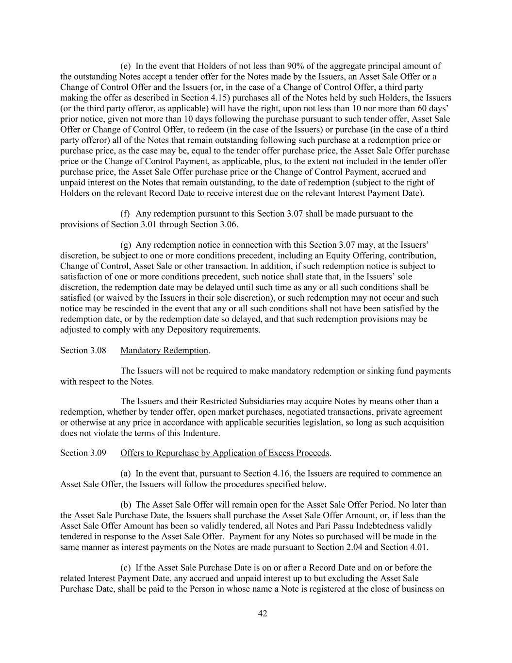 42(e)如果未偿还票据本金总额不少于90%的持有人接受发行人对票据提出的要约收购、资产出售要约或控制权变更要约以及发行人(或在控制权变更要约的情况下,由第4.15节所述的第三方提出要约)购买该等持有人所持有的全部票据,则发行人(或第三方要约人,如适用)将有权,在根据该要约收购、资产出售要约或控制权变更要约进行购买后不少于10天但不超过60天的事先通知下,以赎回(如为发行人)或购买(如为第三方要约人)在该购买后仍未偿还的所有票据,赎回价格或购买价格(视情况而定)等于要约收购价格、资产出售要约购买价格或控制权变更付款(如适用),再加上,在不包括在要约收购价格、资产出售要约收购价格或控制权变更付款、仍未偿还的票据的应计未付利息的范围内,至赎回日期(以相关记录日期持有人有权收取相关付息日到期的利息为准)。(f)依据本条第3.07条作出的任何赎回,须依据第3.01条至第3.06条的条文作出。(g)任何与本条3.07有关的赎回通知,可由发行人酌情决定,受一项或多项先决条件的规限,包括股权发售、出资、控制权变更、资产出售或其他交易。此外,如该等赎回通知须满足一项或多项先决条件,则该通知须说明,发行人可自行酌情决定将赎回日期延迟至任何或所有该等条件均获满足(或由发行人自行决定豁免),或在任何或所有该等条件于赎回日期或于如此延迟的赎回日期未获满足的情况下,不得发生该等赎回而该等通知可予撤销,并可调整该等赎回条款以符合任何存管规定。第3.08节强制赎回。发行人将无需就票据进行强制赎回或偿债基金支付。发行人及其受限制子公司可以根据适用的证券法以任何价格通过要约收购、公开市场购买、协议交易、私下协议或其他方式以赎回以外的方式收购票据,只要此类收购不违反本契约的条款。第3.09节应用超额收益进行回购的要约。(a)如果根据第4.16条,发行人被要求开始资产出售要约,发行人将遵循以下规定的程序。(b)资产出售要约将在资产出售要约期内继续开放。不迟于资产出售购买日,发行人应购买资产出售要约金额,或者,如果低于已如此有效投标的资产出售要约金额,则应购买针对资产出售要约有效投标的所有票据和Pari Passu债务。如此购买的任何票据的付款方式将与根据第2.04节和第4.01节支付票据利息的方式相同。(c)如资产出售购买日是在记录日期或之后,以及在相关利息支付日或之前,则截至但不包括资产出售购买日的任何应计及未付利息,须于营业时间结束时支付予以其名义登记票据的人