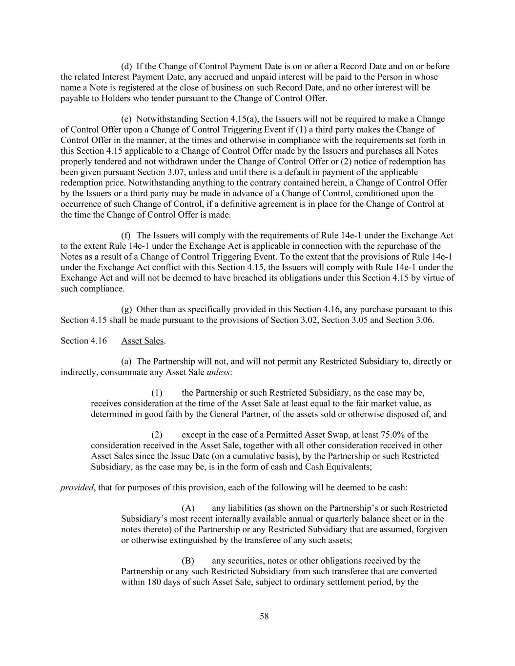 58(d)如果控制权变更支付日是在记录日期或之后,以及在相关利息支付日或之前,任何应计未付利息将在该记录日期的营业时间结束时支付给以其名义登记票据的人,而根据控制权变更要约投标的持有人将不会获得任何其他利息。(e)尽管有第4.15(a)条的规定,如(1)第三方按照适用于发行人作出的控制权变更要约的方式、时间或其他方式作出控制权变更要约,并购买根据控制权变更要约适当提交且未撤回的所有票据,或(2)已根据第3.07条发出赎回通知,则发行人无须在控制权变更触发事件发生时作出控制权变更要约,除非且直到出现适用的赎回价格的支付违约。尽管有任何相反的规定,发行人或第三方的控制权变更要约可以在控制权变更之前作出,条件是发生这种控制权变更,如果在控制权变更要约作出时就控制权变更达成了最终协议。(f)发行人将遵守《交易法》第14e-1条的要求,但以《交易法》第14e-1条适用于因控制权触发事件而回购票据为限。如果《交易法》第14e-1条的规定与本第4.15条相冲突,发行人将遵守《交易法》第14e-1条的规定,并且不会因这种遵守而被视为违反了其在本第4.15条下的义务。(g)除本条第4.16条具体规定外,依据本条第4.15条进行的任何购买均应依据第3.02条、第3.05条和第3.06条的规定进行。第4.16节资产出售。(a)合伙企业不会、也不会允许任何受限制的附属公司直接或间接完成任何资产出售,除非:(1)合伙企业或该受限制的附属公司(视情况而定)在资产出售时收到至少等于所出售或以其他方式处置的资产的公平市场价值的对价,(2)除许可的资产互换外,至少为资产出售中收到的对价的75.0%,合伙企业或此类受限子公司(视情况而定)自发行日起在其他资产出售中收到的所有其他对价连同现金和现金等价物的形式;但就本规定而言,以下每一项将被视为现金:(a)合伙企业或此类受限子公司最近的内部可用年度或季度资产负债表或其附注中显示的任何负债(如合伙企业或此类受限子公司所承担的),由受让人免除或以其他方式消灭任何此类资产;(b)合伙企业或任何此类受限制子公司从此类受让人收到的任何证券、票据或其他义务,这些证券、票据或义务在此类资产出售后的180天内转换,但以普通结算期为限,由