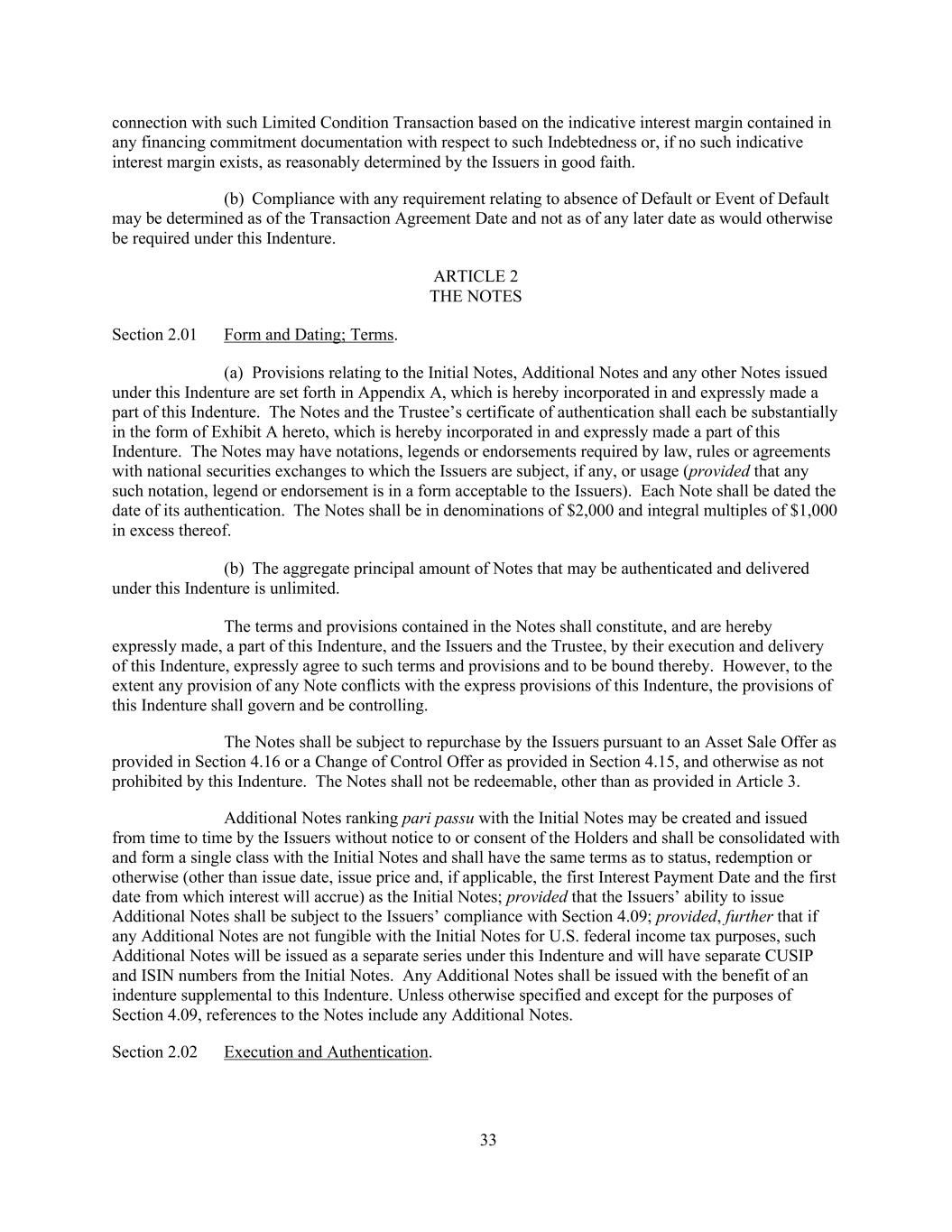 33与此类有限条件交易的联系,其依据是任何融资承诺文件中包含的与此类债务有关的指示性利差,如果不存在此类指示性利差,则由发行人善意合理确定。(b)遵守与不存在违约或违约事件有关的任何要求,可在交易协议日期确定,而不是在本契约规定的任何较后日期确定。第二条注第2.01款形式和日期;条款。(a)与初始票据、附加票据及根据本契约发行的任何其他票据有关的条文载于附录A,该附录A特此纳入本契约并明确成为其一部分。票据和受托人的认证证书应各自基本上采用本合同的附件 A的形式,本合同特此将其纳入本义齿并明确成为其一部分。票据可能有法律、规则或发行人须遵守的国家证券交易所的协议(如有)要求的注释、图例或背书,或用法(前提是任何此类注释、图例或背书采用发行人可接受的形式)。每份说明应注明其认证日期。票据的面额应为2000美元,超过1000美元的整数倍。(b)根据本契约可认证和交付的票据本金总额是无限的。票据中包含的条款和规定应构成本契约的一部分,并在此明确作出,发行人和受托人通过执行和交付本契约,明确同意此类条款和规定并受其约束。但是,如果任何票据的任何规定与本义齿的明文规定相冲突,则本义齿的规定应受管辖和控制。票据须由发行人根据第4.16条规定的资产出售要约或第4.15条规定的控制权变更要约进行回购,否则不受本契约禁止。票据不得赎回,但第3条规定的除外。与初始票据享有同等地位的附加票据可由发行人不时创设和发行,而无须通知持有人或征得其同意,并应与初始票据合并并与初始票据形成单一类别,并应具有与状态、赎回或其他方面相同的条款(发行日期、发行价格以及(如适用),第一个付息日和第一个计息日)作为初始票据;前提是发行人发行附加票据的能力应以发行人遵守第4.09节为准;此外,如果任何附加票据在美国联邦所得税方面不能与初始票据互换,则此类附加票据将在此契约下作为单独的系列发行,并将具有与初始票据分开的CUSIP和ISIN号。任何附加票据应以补充本契约的契约的利益发行。除非另有规定,并为第4.09条的目的,对《说明》的提述包括任何附加说明。第2.02节执行和认证。
