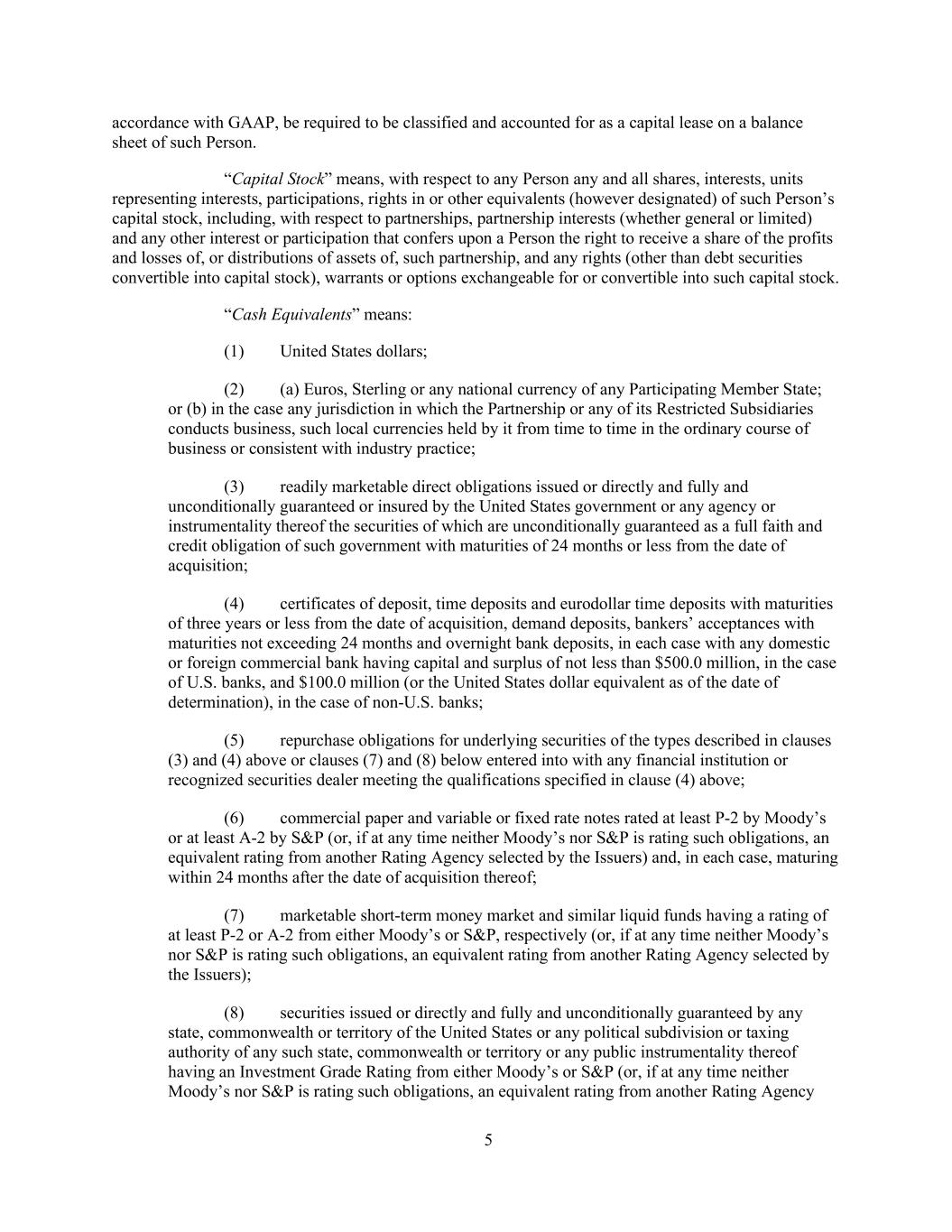 5按照公认会计原则,被要求在这类人的资产负债表上作为资本租赁进行分类和会计处理。“股本”是指,就任何人而言,代表该人股本的任何和所有股份、权益、单位的权益、参与、权利或其他等价物(无论如何指定),包括就合伙企业而言,合伙企业权益(无论是普通权益还是有限权益)以及任何其他权益或参与,授予某人有权获得该合伙企业的利润和亏损份额或资产分配,以及任何权利(可转换为股本的债务证券除外)、可交换或可转换为该股本的认股权证或期权。“现金等价物”是指:(1)美元;(2)(a)欧元、英镑或任何参与成员国的任何国家货币;或(b)在这种情况下,合伙企业或其任何受限制的子公司开展业务的任何司法管辖区,其在正常经营过程中不时持有或符合行业惯例的当地货币;(3)由美国政府或其任何机构或工具发行或直接、全面和无条件担保或投保的易于销售的直接债务,其证券作为该政府的完全信用和信用债务无条件担保,期限为自收购之日起24个月或更短;(4)自收购之日起三年或更短期限的存单、定期存款和欧洲美元定期存款,活期存款、期限不超过24个月的银行家承兑汇票和隔夜银行存款,在每种情况下,任何国内或外国商业银行的资本和盈余不少于5亿美元,在美国银行的情况下,以及1亿美元(或截至确定之日的等值美元),就非美国银行而言;(5)与符合上述第(4)条规定资格的任何金融机构或认可证券交易商订立的上文第(3)和(4)条所述类型或下文第(7)和(8)条所述类型的基础证券的回购义务;(6)穆迪评级至少为P-2或标普评级至少为A-2的商业票据和浮动或固定利率票据(或者,如果穆迪和标普在任何时候均未对此类义务进行评级,则由发行人选择的其他评级机构给予同等评级),并且在每种情况下,自收购之日起24个月内到期;(7)分别获得穆迪或标普至少P-2或A-2评级的有价短期货币市场和类似流动资金(或者,如果在任何时候穆迪或标普均未对此类义务进行评级,则获得发行人选择的其他评级机构的同等评级);(8)由美国任何州、联邦或领地或任何此类州的任何政治细分或税务机关发行或直接全额无条件担保的证券,英联邦或领地或其任何公共工具,具有穆迪或标普的投资级评级(或者,如果在任何时候穆迪和标普都不对此类义务进行评级,则需要另一评级机构的同等评级