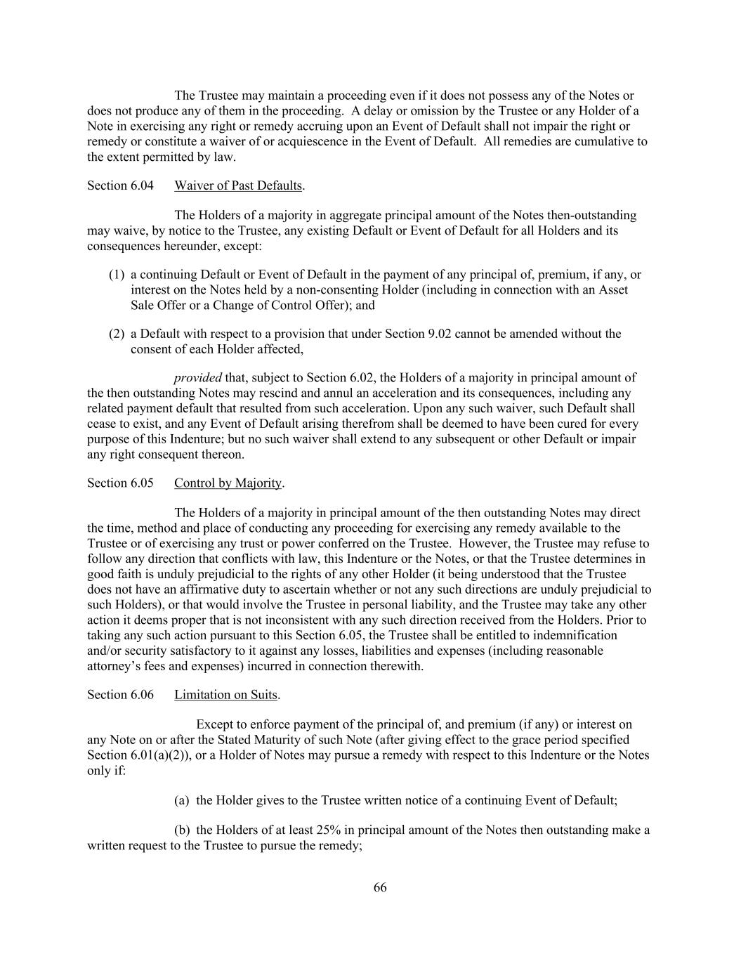 66即使受托人没有持有任何票据或没有在该程序中出示其中任何票据,受托人仍可维持一项程序。受托人或票据的任何持有人在行使因违约事件而产生的任何权利或补救措施时的迟延或不作为,不得损害该权利或补救措施,或构成对违约事件的放弃或默许。在法律允许的范围内,所有补救办法都是累积的。第6.04节过去违约的豁免。持有当时未偿还票据本金总额多数的持有人,可藉向受托人发出的通知,豁免所有持有人的任何现有违约或违约事件及其在本协议下的后果,但以下情况除外:(1)在支付任何本金、溢价(如有)方面的持续违约或违约事件,或非同意持有人所持票据的利息(包括与资产出售要约或控制权变更要约有关的);及(2)与根据第9.02条未经受影响的每个持有人同意不得修订的条文有关的违约,但在符合第6.02条的规定下,当时未偿还票据本金多数的持有人可撤销并取消加速及其后果,包括因该加速而导致的任何相关付款违约。一旦作出任何该等放弃,该等违约即告不复存在,而由此产生的任何违约事件须当作已为本契约的每项目的而得到纠正;但该等放弃不得延伸至任何其后或其他违约或损害由此产生的任何权利。第6.05节多数控制。持有当时未偿还票据本金多数的持有人可指示进行任何程序以行使受托人可用的任何补救或行使授予受托人的任何信托或权力的时间、方法和地点。然而,受托人可拒绝遵循与法律、本契约或票据相冲突的任何指示,或受托人善意地确定对任何其他持有人的权利有不适当的损害(有一项理解,即受托人没有确定任何此类指示是否对此类持有人有不适当的损害的肯定义务),或将涉及受托人的个人责任,并且受托人可采取其认为适当的与从持有人收到的任何此类指示不矛盾的任何其他行动。在依据本条第6.05条采取任何此类行动之前,受托人有权就与此相关的任何损失、责任和开支(包括合理的律师费和开支)获得其满意的赔偿和/或担保。第6.06条诉讼时效。除非强制执行任何票据的本金、溢价(如有的话)或利息在该票据的所述到期日或之后(在使第6.01(a)(2)条指明的宽限期生效后)支付,或票据持有人只有在以下情况下才可就本契约或票据寻求补救:(a)持有人向受托人发出持续违约事件的书面通知;(b)持有当时尚未偿付的票据本金至少25%的持有人向受托人提出寻求补救的书面请求;
